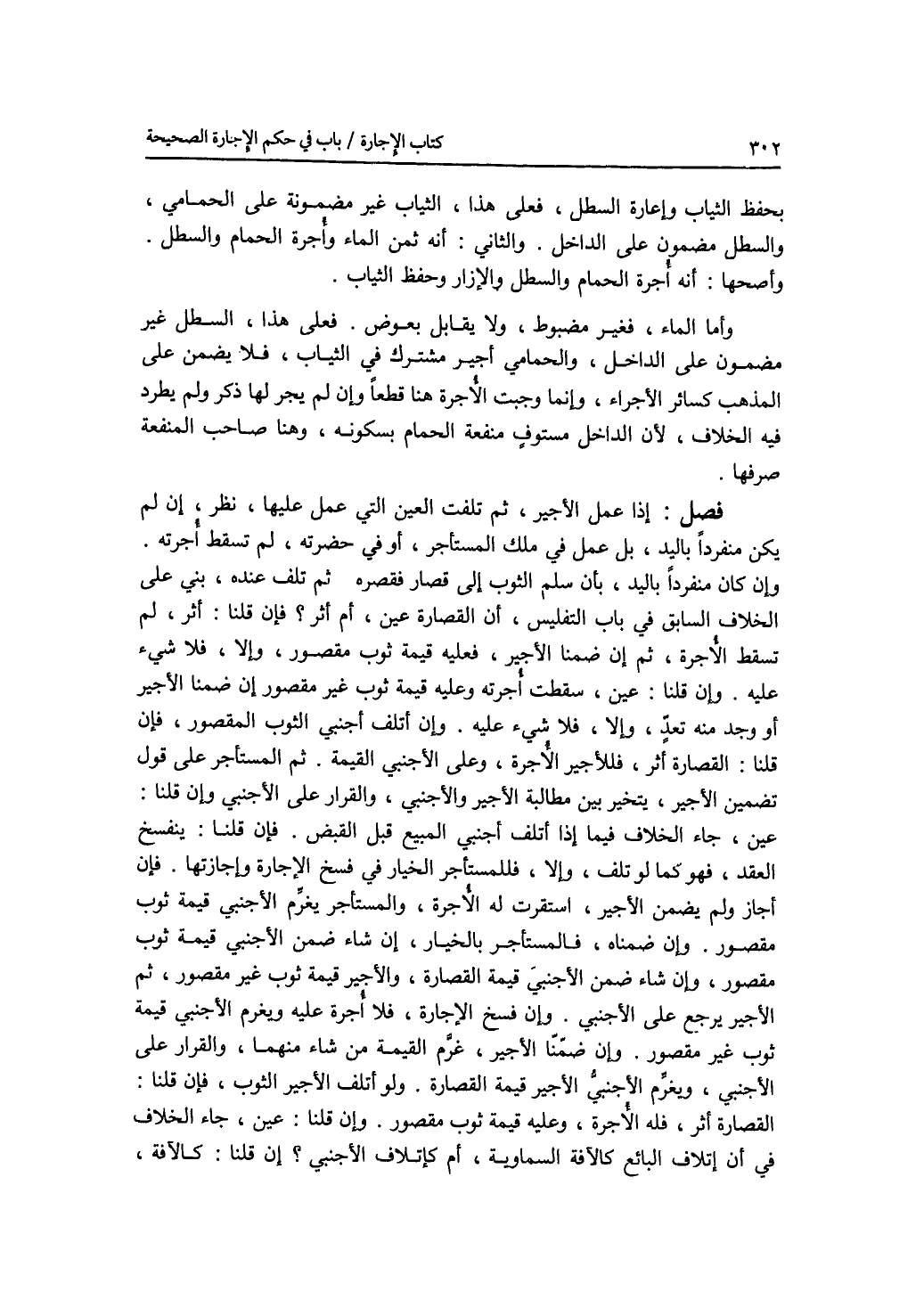 بحفظ الثياب وإعارة السطل، فعلى هذا، الثياب غير مضمونة على الحمامي، والسطل مضمون على الداخل. والثاني: أنه ثمن الماء وأجرة الحمام والسطل. وأصحها: أنه أجرة الحمام والسطل والازار وحفظ الثياب. وأما الماء، فغير مضبوط، ولا يقابل بعوض. فعلى هذا، السطل غير مضمون على الداخل، والحمامي أجير مشترك في الثياب، فلا يضمن على المذهب كسائر الاجراء، وإنما وجبت الاجرة هنا وإن لم يجر لها ذكر ولم يطرد فيه الخلاف، لان الداخل مستوف منفعة الحمام بسكونه، وهناك صاحب المنفعة صرفها. فصل إذا عمل الاجير، ثم تلفت العين التي عمل عليها، نظر، إن لم يكن منفردا باليد، بل عمل في ملك المستأجر، أو في حضرته، لم تسقط أجرته. وإن كان منفردا باليد، بأن سلم الثوب إلى قصار فقصره، ثم تلف عنده، بني على الخلاف السابق في باب التفليس، أن القصارة عين، أم أثر ؟ فإن قلنا: أثر، لم تسقط الاجرة، ثم إن ضمنا الاجير، فعليه قيمة ثوب مقصور، وإلا، فلا شئ عليه. وإن قلنا: عين، سقطت أجرته وعليه قيمة ثوب غير مقصور إن ضمنا الاجير أو وجد منه تعد، وإلا، فلا شئ عليه. وإن أتلف أجنبي الثوب المقصور، فإن قلنا: القصارة أثر، فللاجير الاجرة، وعلى الاجنبي القيمة. ثم المستأجر على قول تضمين الاجير، يتخير بين مطالبة الاجير والاجنبي، والقرار على الاجنبي. وإن قلنا: عين، جاء الخلاف فيما إذا أتلف أجنبي المبيع قبل القبض. فإن قلنا: ينفسخ العقد، فهو كما لو تلف، وإلا، فللمستأجر الخيار في فسخ الاجارة وإجازتها. فإن أجاز ولم يضمن الاجير، استقرت له الاجرة، والمستأجر يغرم الاجنبي قيمة ثوب مقصور. وإن ضمناه، فالمستأجر بالخيار، إن شاء ضمن الاجنبي قيمة ثوب مقصور، وإن شاء ضمن الاجنبي قيمة القصارة، والاجير قيمة ثوب غير مقصور، ثم الاجير يرجع على الاجنبي. وإن فسخ الاجارة، فلا أجرة عليه ويغرم الاجنبي قيمة ثوب غير مقصور. وإن ضمنا الاجير، غرم القيمة من شاء منهما، والقرار على الاجنبي ويغرم الاجنبي الاجير قيمة القصارة. ولو أتلف الاجير الثوب، فإن قلنا: القصارة أثر، فله الاجرة، وعليه قيمة ثوب مقصور. وإن قلنا: عين، جاء الخلاف في أن إتلاف البائع كالآفة السماوية، أم كإتلاف الاجنبي ؟ إن قلنا: كالآفة،