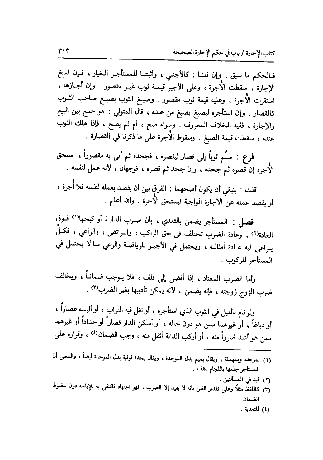 فالحكم ما سبق. وإن قلنا: كالاجنبي، وأثبتنا للمستأجر الخيار، فإن فسخ الاجارة، سقطت الاجرة وعلى الاجير قيمة ثوب غير مقصور. وإن أجازها، استقرت الاجرة، وعليه قيمة ثوب مقصور. وصبغ ولثوب بصبغ صاحب الثوب كالقصار. وإن استأجره ليصبغ بصبغ من عنده، قال المتولي: هو جمع بين البيع والاجارة، ففيه الخلاف المعروف. وسواء صح، أم لم يصح، فإذا هلك الثوب عنده، سقطت قيمة الصبغ. وسقوط الاجرة على ما ذكرنا في القصارة. فرع سلم ثوبا إلى قصار ليقصره، فجحده ثم أتى به مقصورا، استحق الاجرة إن قصره ثم جحد، وإن جحد ثم قصره، فوجهان، لانه عمل لنفسه. قلت: ينبغي أن يكون أصحهما: الفرق بين أن يقصد بعمله لنفسه فلا أجرة، أو يقصد عمله عن الاجارة الواجبة فيستحق الاجرة. والله أعلم فصل المستأجر يضمن بالتعدي، بأن ضرب الدابة أو كبحها فوق العادة، وعادة الضرب تختلف في حق الراكب، والرائض، والراعي، فكل يراعى فيه عادة أمثاله، ويحتمل في الاجير للرياضة والرعي ما لا يحتمل في المستأجر للركوب. وأما الضرب المعتاد، إذا أفضى إلى تلف، فلا يوجب ضمانا، ويخالف ضرب الزوج زوجته، فإنه مضمن، لانه يمكن تأديبها بغير الضرب. ولو نام بالليل في الثوب الذي استأجره، أو نقل فيه التراب، أو ألبسه عصارا، أو دباغا، أو غيرهما ممن هو دون حاله، أو أسكن الدار قصارا أو حدادا أو غيرهما ممن هو أشد ضررا منه، أو أركب الدابة أثقل منه، وجب الضمان، وقراره على