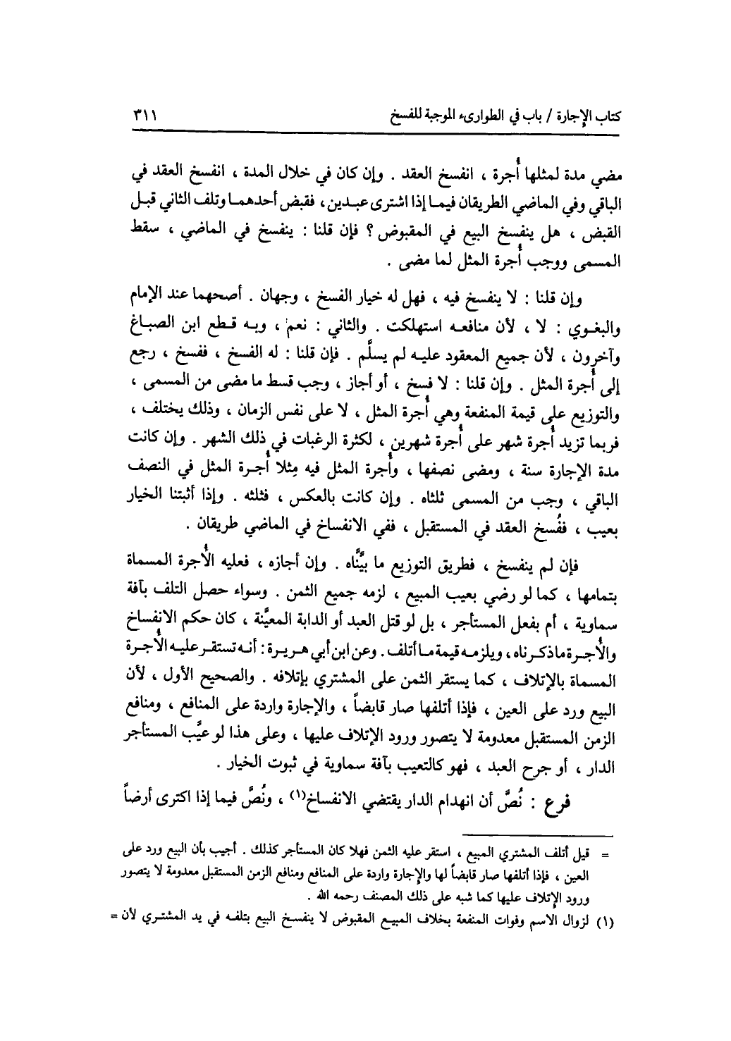 مضي مدة لمثلها أجرة، انفسخ العقد. وإن كان في خلال المدة، انفسخ العقد في الباقي وفي الماضي الطريقان فيما إذا اشترى عبدين، فقبض أحدهما وتلف الثاني قبل القبض، هل ينفسخ البيع في المقبوض ؟ فإن قلنا: ينفسخ في الماضي، سقط المسمى ووجب أجرة المثل لما مضى. وإن قلنا: لا ينفسخ فيه، فهل له خيار الفسخ ؟ وجهان. أصحهما عند الامام والبغوي: لا، لان منافعه استهلكت. والثاني: نعم، وبه قطع ابن الصباغ وآرون، لان جميع المعقود عليه لم يسلم. فإن قلنا: له الفسخ، ففسخ، رجع إ لى أجرة المثل. وإن قلنا: لا فسخ، أو أجاز، وجب قسط ما مضى من المسمى، والتوزيع على قيمة المنفعة وهي أجرة المثل، لا على نفس الزمان، وذلك يختلف، فربما تزيد أجرة شهر على أجرة شهرين، لكثرة الرغبات في ذلك الشهر. وإن كدنت مدة الاجارة سنة، ومضى نصفها، وأجرة المثل فيه مثلا أجرة المثل في النصف الباقي، وجب من المسمى ثلثاه. وإن كانت بالعكس، فثلثه. وإذا أثبتنا الخيار بعيب، ففسخ العقد في المستقبل، ففي الانفساخ في الماضي الطريقان. فإن لم ينفسخ، فطريق التوزيع ما بيناه. وإن أجازه، فعليه الاجرة المسماة بتمامها، كما لو رضي بعيب المبيع، لزمه جميع الثمن. وسواء حصل التلف بآفة سماوية، أم بفعل المستأجر، بل لو قتل العبد أو الدابة المعينة، كان حكم الانفساخ والاجرة ما ذكرناه، ويلزمه قيمة ما أتلف. وعن ابن أبي هريرة: أنه تستقر عليه الاجرة المسماة بالاتلاف كما يستقر الثمن على المشتري بإتلافه. والصحيح الاول، لان البيع ورد على العين، فإذا أتلفها صار قابضا، والاجارة واردة على المنافع، ومنافع الزمن المستقبل معدومة لا يتصور ورود الاتلاف عليها، وعلى هذا لو عيب المستأجر الدار، أو جرح العبد، فهو كالتعيب بآفة سماوية في ثبوت الخيار. فرع نص أن انهدام الدار يقتضي الانفساخ، ونص فيما إذا اكترى أرضا