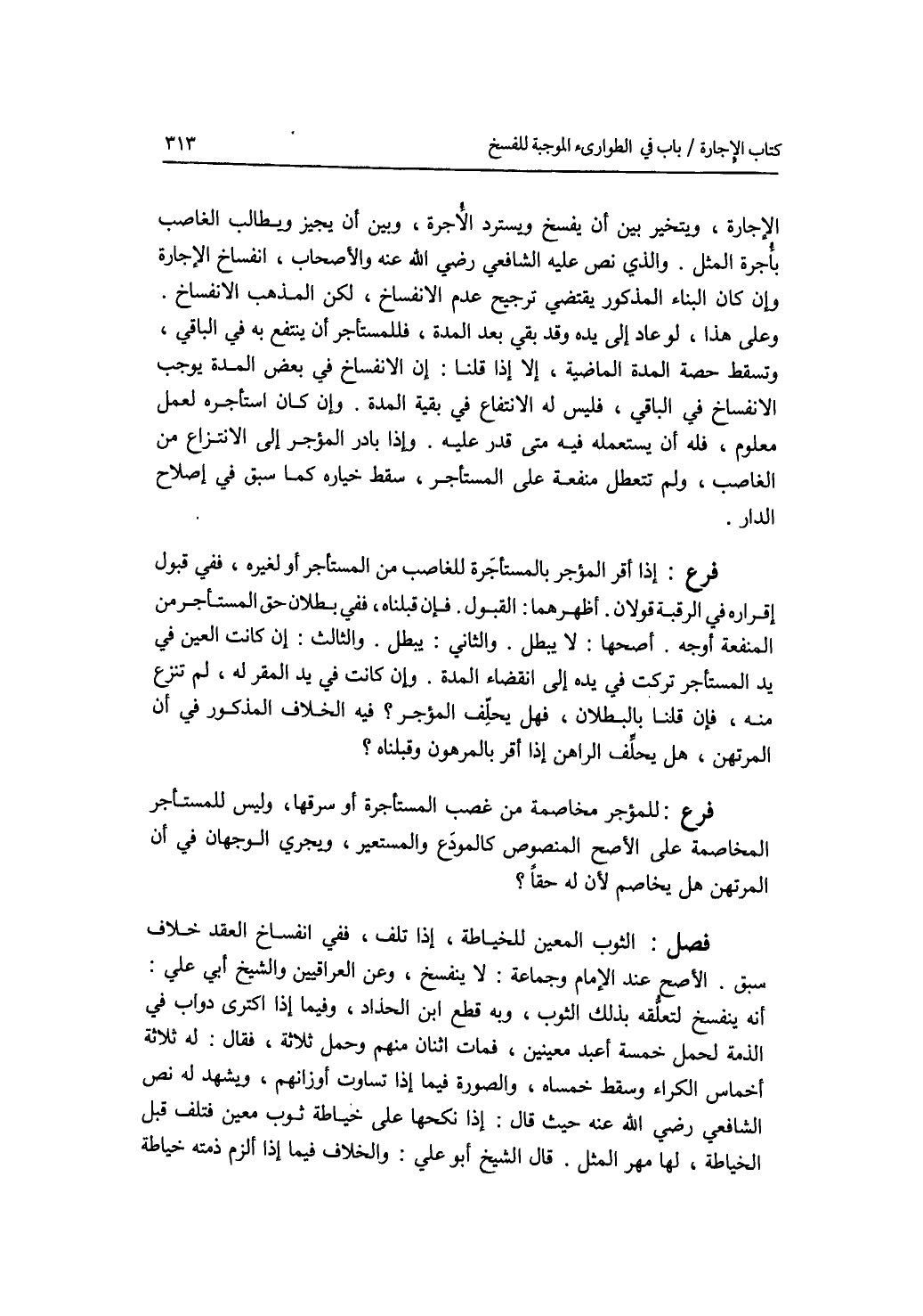 فصل الثوب المعين للخياطة، إذا تلف، ففي انفساخ العقد خلاف سبق. الاصح عند الامام وجماعة: لا ينفسخ، وعن العراقيين والشيخ أبي علي: أنه ينفسخ لتعلقه بذلك الثوب، وبه قطع ابن الحداد، وفيما إذا اكترى دواب في الذمة لحمل خمسة أعبد معينين، فمات إثنان منهم وحمل ثلاثة، فقال: له ثلاثة أخماس الكراء وسقط خمساه، والصورة فيما إذا تساوت أوزانهم، ويشهد له نص الشافعي رضي الله عنه حيث قال: إذا نكحها على خياطة ثوب معين فتلف قبل الخياطة، لها مهر المثل. قال الشيخ أبو علي: والخلاف فيما إذا ألزم ذمته خياطة