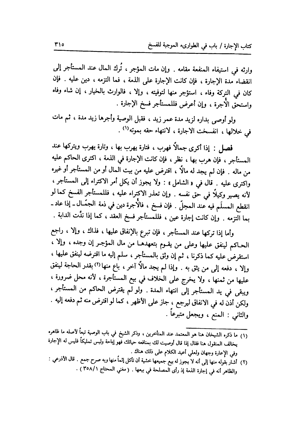 وارثه في استيفاء المنفعة مقامه. وإن مات المؤجر، ترك المال عند المستأجر إلى انقضاء مدة الاجارة، فإن كانت الاجارة على الذمة، فما التزمه، دين عليه. فإن كان في التركة وفاء، استؤجر منها لتوفيته، وإلا، فالواراث بالخيار، إن شاء وفاه واستحق الاجرة، وإن أعرض فللمستأجر فسخ الاجارة. ولو أوصى بداره لزيد مدة عمر زيد، فقبل الوصية، وأجرها زيد مدة، ثم مات في خلالها، انفسخت الاجارة، لانتهاء حقه بموته. فصل إذا أكرى جمالا فهرب، فتارة يهرب بها، وتارة يهرب ويتركها عند المستأجر، فإن هرب بها، نظر، فإن كانت الاجارة في الذمة، إكترى الحاكم عليه من ماله. فإن لم يجد له مالا، اقترض عليه من بيت المال أو من المستأجر أو غيره واكترى عليه. قال في الشامل: ولا يجوز أن يكل أمر الاكتراء إلى المستأجر، لانه يصير وكيلا في حق نفسه. وإن تعذر الاكتراء عليه، فللمستأجر الفسخ كما لو انقطع المسلم فيه عند المحل. فإن فسخ، فالاجرة دين في ذمة الجمال وإن لم يفسخ، فله مطالبة الجمال - إذا عاد - بما التزمه. وإن كانت إجارة عين، فللمستأجر فسخ العقد، كما أذا ندت الدابة. وأما إذا تركها عند المستأجر، فإن تبرع بالانفاق عليها، فذاك، وإلا، راجع الحاكم لينفق عليها وعلى من يقوم بتعهدها من مال المؤجر إن وجده، وإلا، استقرض عليه كما ذكرنا، ثم إن وثق بالمستأجر، سلم إليه ما اقترضه لينفق عليها، وإلا، دفعه إلى من يثق به. وإذا لم يجد مالا آخر، باع منها بقدر الحاجة لينفق عليها من ثمنه، ولا يخرج على الخلاف في بيع المستأجرة، لانه محل ضرورة، ويبقى في يد المستأجر إلى انتهاء المدة. ولو لم يقترض الحاكم من المستأجر، ولكن أذن له في الانفاق ليرجع، جاز على الاظهر، كما لو اقترض منه ثم دفعه إليه. والثاني: المنع، ويجعل متبرعا.
