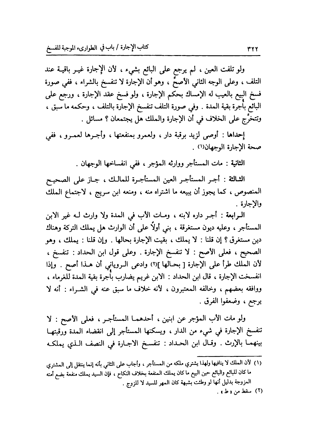 ولو تلفت العين، لم يرجع على البائع بشئ، لان الاجارة غير باقية عند التلف، وعلى الوجه الثاني الاصح، وهو أن الاجارة لا تنفسخ بالشراء، ففي صورة فسخ البيع بالعيب له الامساك بحكم الاجارة، ولو فسخ عقد الاجارة، رجع على البائع بأجرة بقية المدة. وفي صورة التلف تنفسخ الاجارة بالتلف، وحكمه ما سبق، وتتخرج على الخلاف في أن الاجارة والملك هل يجتمعان ؟ مسائل. إحداها: أوصى لزيد برقبة دار، ولعمرو بمنفعتها، وأجرها لعمرو، ففي صحة الاجارة الوجهان. الثانية: مات المستأجر ووارثه، المؤجر ففي انفساخها الوجهان. الثالثة: أجر المستأجر العين المستأجرة للمالك، جاز على الصحيح المنصوص، كما يجوز أن يبيعه ما اشتراه منه، ومنعه ابن سريج، لاجتماع الملك والاجارة. الرابعة: أجر داره لابنه، ومات الاب في المدة ولا وارث له غير الابن المستأجر، وعليه ديون مستغرقة، بني أولا على أن الوارث هل يملك التركة وهناك دين مستغرق ؟ إن قلنا: لا يملك، بقيت الاجارة بحالها. وإن قلنا: يملك، وهو الصحيح، فعلى الاصح: لا تنفسخ الاجارة. وعلى قول ابن الحداد: تنفسخ، لان الملك طرأ على الاجارة. وادعى الروياني أن هذا أصح. وإذا انفسخت الاجارة، قال ابن الحداد: الابن غريم يضارب بأجرة بقية المدة للغرماء، ووافقه بعضهم، وخالفه المعتبرون، لانه خلاف ما سبق عنه في الشراء: أنه لا يرجع، وضعفوا الفرق. ولو مات الاب المؤجر عن ابنين، أحدهما المستئجر، فعلى الاصح: لا تنفسخ الاجارة في شئ من الدار، ويسكنها المستأجر إلى انقضاء المدة، ورقبتها بينهما بالارث. وقال ابن الحداد: تنفسخ الاجارة في النصف الذي يملكه