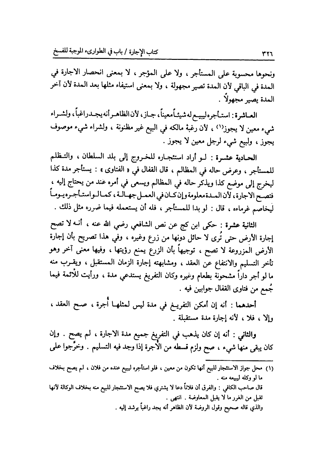 ونحوها محسوبة على المستأجر، ولا على المؤجر، لا بمعنى انحصار الاجارة في المدة في الباقي لان المدة تصير مجهولة، ولا بمعنى استيفاء مثلها بعد المدة لان آخر المدة يصير مجهولا. العاشرة: استأجره ليبيع له شيئا معينا، جاز، لان الظاهر أنه يجد راغبا، ولشراء شئ معين لا يجوز، لان رغبة مالكه في البيع غير مظنونة، ولشراء شئ موصوف يجوز، ولبيع شئ معين لا يجوز. الحادية عشرة: لو أراد استئجاره للخروج إلى بلد السلطان، والتظلم للمستأجر، وعرض حاله في المظالم، قال القفال في الفتاوى: يستأجر مدة كذا ليخرج إلى موضع كذا ويذكر حاله في المظالم ويسعى في أمره عند من يحتاج إليه، فتصح الاجارة، لان المدة معلومة وإن كان في العمل جهالة، كما لو استأجره يوما ليخاصم غرماءه، قال: ولو بدا للمستأجر، فله أن يستعمله فيما ضرره مثل ذلك. الثانية عشرة: حكى ابن كج عن نص الشافعي رضي الله عنه، أنه لا تصح إجارة الارض حتى ترى لا حائل دونها من زرع وغيره، وفي هذا تصريح بأن إجارة الارض المزروعة لا تصح، توجيها بأن الزرع يمنع رؤيتها، وفيها معنى آخر وهو تأخر التسليم والانتفاع عن العقد، ومشابهته إجارة الزمان المستقبل، ويقرب منه ما لو أجر دارا مشحونة بطعام وغيره وكان التفريغ يستدعي مدة، ورأيت للائمة فيما جمع من فتاوى القفال جوابين فيه. أحدهما: أنه إن أمكن التفريغ في مدة ليس لمثلها أجرة، صح العقد، وإلا، فلا، لانه إجارة مدة مستقبلة. والثاني: أنه إن كان يذهب في التفريغ جميع مدة الاجارة، لم يصح. وإن كان يبقى منها شئ، صح ولزم قسطه من الاجرة إذا وجد فيه التسليم. وخرجوا على