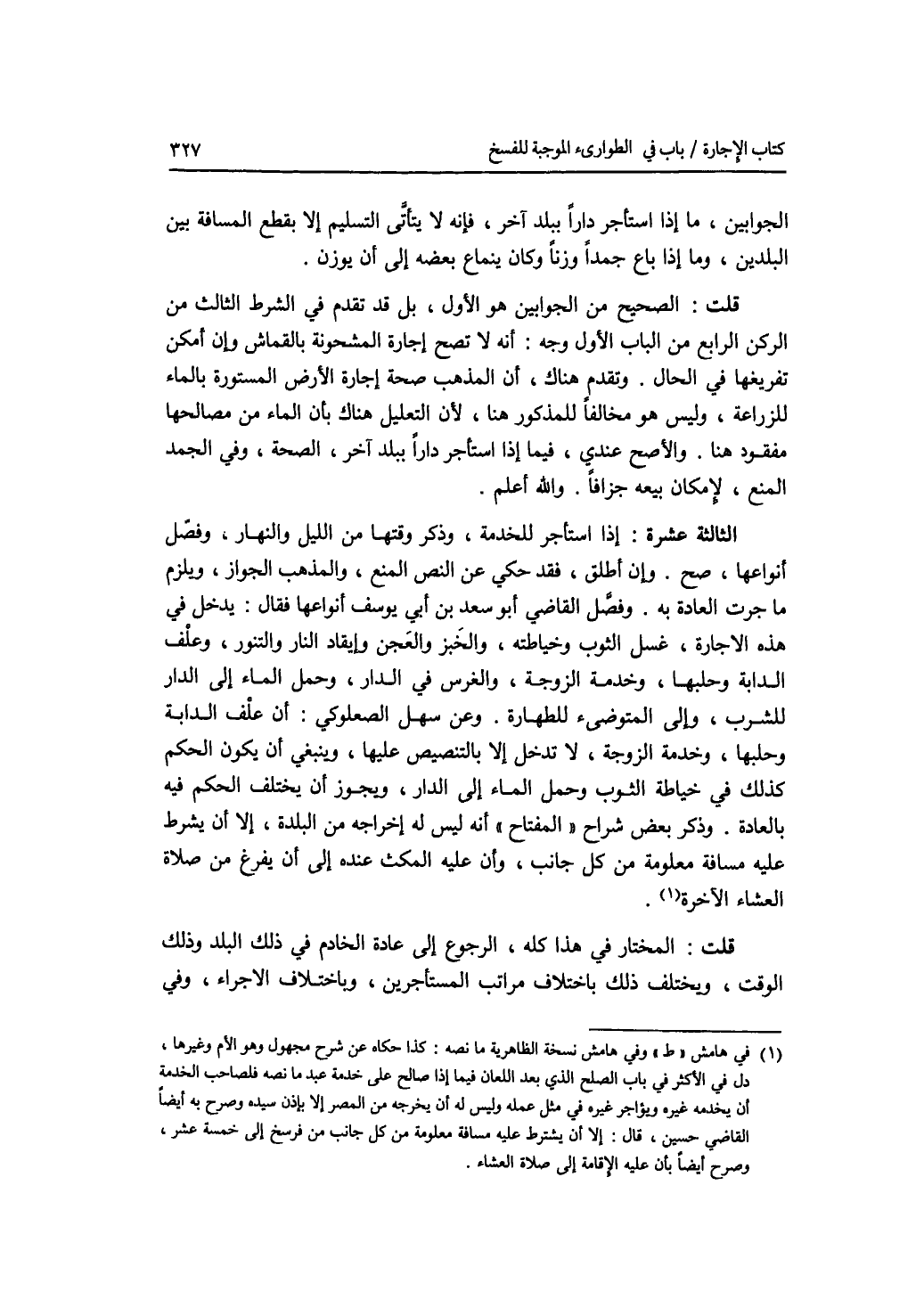 الجوابين، ما إذا استأجر دارا ببلد آخر، فإنه لا يتأنى التسليم إلا بقطع المسافة بين البلدين، وما إذا (باع) جمدا وزنا وكان ينماع بعضه إلى أن يوزن. قلت: الصحيح من الجوابين هو الاول، بل قد تقدم في الشرط الثالث من الركن الرابع من الباب الاول وجه: أنه لا تصح إجارة المشحونة بالقماش وإن أمكن تفريغها في الحال. وتقدم هناك، أن المذهب صحة إجارة الارض المستورة بالماء للزراعة، وليس هو مخالفا للمذكور هنا، لان التعليل هناك بأن الماء من مصالحها مفقود هنا. والاصح عندي، فيما إذا استأجر دارا ببلد آخر، الصحة، وفي الجمد المنع، لامكان بيعه جزافا. والله أعلم الثالثة عشرة: إذا استأجر للخدمة، وذكر وقتها من الليل والنهار، وفصل أنواعها، صح. وإن أطلق، فقد حكي عن النص المنع، والمذهب الجواز، ويلزم ما جرت العادة به. وفصل القاضي أبو سعد بن أبي يوسف أنواعها فقال: يدخل في هذه الاجارة، غسل الثوب وخياطته، والخبز والعجن وإيقاد النار والتنور، وعلف الدابة وحلبها، وخدمة الزوجة، والغرس في الدار، وحمل الماء إلى الدار للشرب، وإلى المتوضئ للطهارة. وعن سهل الصعلوكي: أن علف الدابة وحلبها، وخدمه الزوجة، لا تدخل إلا بالتنصيص عليها، وينبغي أن يكون الحكم كذلك في خياطة الثوب وحمل الماء إلى الدار، ويجوز أن يختلف الحكم فيه بالعادة. وذكر بعض شراح المفتاح أنه ليس له إخراجه من البلدة، إلا أن يشرط عليه مسافة معلومة من كل جانب، وأن عليه المكث عنده إلى أن يفرغ من صلاة العشاء الآخرة. قلت: المختار في هذا كله، الرجوع إلى عادة الخادم في ذلك البلد وذلك الوقت، ويختلف ذلك باختلاف مراتب المستأجرين، وباختلاف الاجراء، وفي