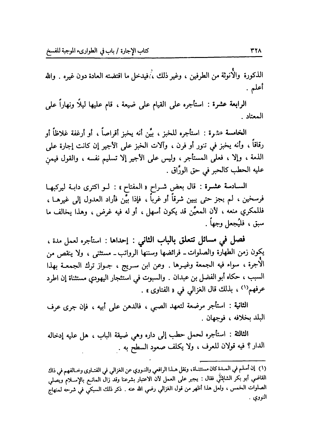 فصل في مسائل تتعلق بالباب الثاني إحداها: استأجره لعمل مدة، يكون زمن الطهارة والصلوات - فرائضها وسننها الرواتب - مستثنى، ولا ينقص من الاجرة، وسواء فيه الجمعة وغيرها. وعن ابن سريج، جواز ترك الجمعة بهذا السبب، حكاه أبو الفضل بن عبدان. والسبوت في استئجار اليهودي مستثناة إن أطرد عرفهم، قال الغزالي ف الفتاوى. الثانية: استأجر مرضعة لتعهد الصبي، فالدهن على أبيه، فإن جرى عرف البلد بخلافه، فوجهان. الثالثة: استأجره لحمل حطب إلى داره وهي ضيقة الباب، هل عليه إدخاله الدار ؟ فيه قولان للعرف، ولا يكلف صعود السطح به.