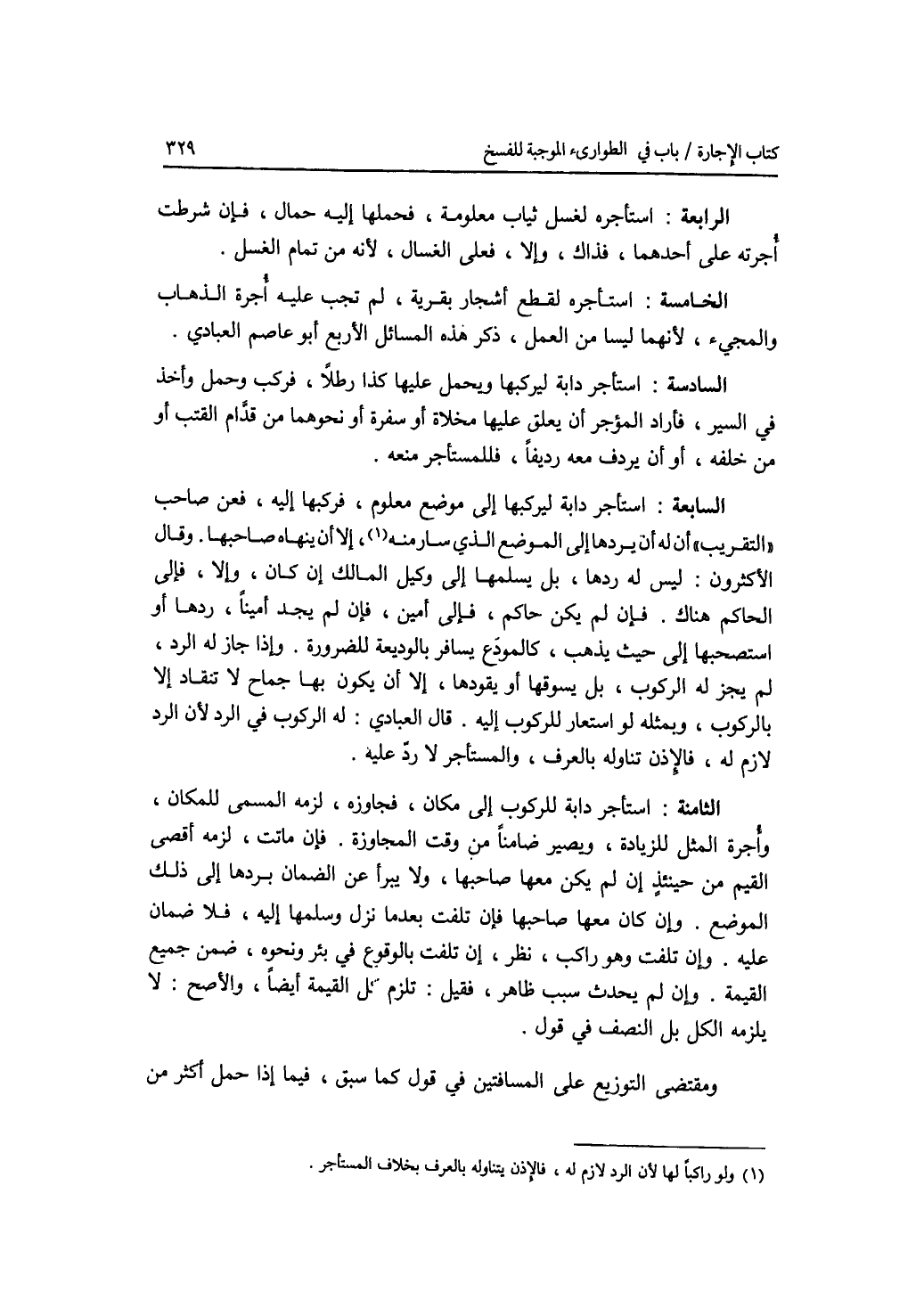 الرابعة: استأجره لغسل ثياب معلومة، فحملها إليه حمال، فإن شرطت أجرته على أحدهما، فذاك، وإلا، فعلى الغسال، لانه من تمام الغسل. الخامسة: استأجره لقطع أشجار بقرية، لم تجب عليه أجرة الذهاب والمجئ، لانهما ليسا من العمل، ذكر هذه المسائل الاربع أبو عاصم العبادي. السادسة: إستأجر دابة ليركبها ويحمل عليها كذا رطلا، فركب وحمل وأخذ في السير، فأراد المؤجر أن يعلق عليها مخلاة أو سفرة أو نحوهما من قدام القتب أو من خلفه، أو أن يردف معه رديفا، فللمستأجر منعه. السابعة: إستأجر دابة ليركبها إلى موضع معلوم، فركبها (إليه)، فعن صاحب التقريب أن له أن يردها إلى الموضع الذي سار منه، إلا أن ينهاه صاحبها. وقال الاكثرون: ليس له ردها، بل يسلمها إلى وكيل المالك إن كان، وإلا، فإلى الحاكم هناك. فإن لم يكن حاكم، فإلى أمين، فإن لم يجد أمينا، ردها أو استصحبها إلى حيث يذهب، كالمودع يسافر بالوديعة للضرورة. وإذا جاز له الرد، لم يجز له الركوب، بل يسوقها أو يقودها، إلا أن يكون بها جماح لاتنقاد إلا بالركوب، وبمثله لو استعار للركوب إليه. قال العبادي: له الركوب في الرد، لان الرد لازم له، فالاذن تناوله بالعرف، والمستأجر لا رد عليه. الثامنة: إستأجر دابة للركوب إلى مكان، فجاوزه، لزمه المسمى للمكان، وأجرة المثل للزيادة، ويصير ضامنا من وقت المجاوزة. فإن ماتت، لزمه أقصى القيم من حينئذ إن لم يكن معها صاحبها، ولا يبرأ عن الضمان بردها إلى ذلك الموضع. وإن كان معها صاحبها، فإن تلفت بعدما نزل وسلمها إليه، فلا ضمان عليه. وإن تلفت وهو راكب، نظر، إن تلفت بالوقوع في بئر ونحوه، ضمن جميع القيمة. وإن لم يحدث سبب ظاهر، فقيل: تلزم كل القيمة أيضا، والاصح: لا يلزمه الكل جل النصف في قول. ومقتضى التوزيع عل المسافتين في قول كما سبق، فيما إذا حمل أكثر من
