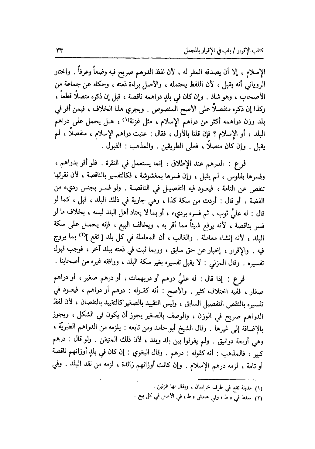 الاسلام، إلا أن يصدقه المقر له، لان لفظ الدرهم صريح فيه وضعا وعرفا. واختار الروياني أنه يقبل، لان اللفظ يحتمله، والاصل براءة ذمته، وحكاه عن جماعة من الاصحاب، وهو شاذ. وإن كان في بلد دراهمه ناقصة، قبل إن ذكره متصلا قطعا، وكذا إن ذكره منفصلا على الاصح المنصوص. ويجري هذا الخلاف، فيمن أقر في بلد وزن دراهمه أكثر من دراهم الاسلام، مثل غزنة، هل يحمل على دراهم البلد، أو الاسلام ؟ فإن قلنا بالاول، فقال: عنيت دراهم الاسلام، منفصلا، لم يقبل. وإن كان متصلا، فعلى الطريقين. والمذهب: القبول. فرع الدرهم عند الاطلاق، إنما يستعمل في النقرة. فلو أقر بدراهم، وفسرها بفلوس، لم يقبل، وإن فسرها بمغشوشة، فكالتفسير بالناقصة، لان نقرتها تنقص عن التامة، فيعود فيه التفصيل في الناقصة. ولو فسر بجنس ردئ من الفضة، أو قال: أردت من سكة كذا، وهي جارية في ذلك البلد، قبل، كما لو قال: له علي ثوب، ثم فسره بردئ، أو بما لا يعتاد أهل البلد لبسه، بخلاف ما لو فسر بناقصة، لانه يرفع شيئا مما أقر به، ويخالف البيع، فإنه يحمل على سكة البلد، لانه إنشاء معاملة. والغالب، أن المعاملة في كل بلد بما يروج فيه. والاقرار، إخبار عن حق سابق، وربما ثبت في ذمته ببلد آخر، فوجب قبول تفسيره. وقال المزني: لا يقبل تفسيره بغير سكة البلد، ووافقه غيره من أصحابنا. فرع إذا قال: له علي درهم أو دريهمات، أو درهم صغير، أو دراهم صغار، ففيه اختلاف كثير. والاصح: أنه كقوله: درهم أو دراهم، فيعود في تفسيره بالنقص التفصيل السابق، وليس التقييد بالصغير كالتقييد بالنقصان، لان لفظ الدراهم صريح في الوزن، والوصف بالصغير يجوز أن يكون في الشكل، ويجوز بالاضافة إلى غيرها. وقال الشيخ أبو حامد ومن تابعه: يلزمه من الدراهم الطبرية، وهي أربعة دوانيق. ولم يفرقوا بين بلد وبلد، لان ذلك المتيقن. ولو قال: درهم كبير، فالمذهب: أنه كقوله: درهم. وقال البغوي: إن كان في بلد أوزانهم ناقصة أو تامة، لزمه درهم الاسلام. وإن كانت أوزانهم زائدة، لزمه من نقد البلد. وفي