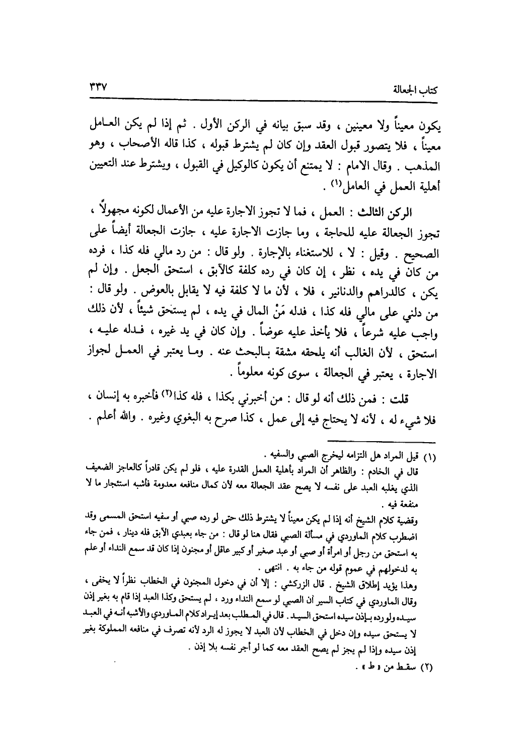 يكون معينا ولا معينين، وقد سبق بيانه في الركن الاول. ثم إذا لم يكن العامل معينا، فلا يتصور قبول العقد وإن كان لم يشترط قبوله، كذا قاله الاصحاب، وهو المذهب. وقال الامام: لا يمتنع أن يكون كالوكيل في القبول، ويشترط عند التعيين أهلية العمل في العامل.