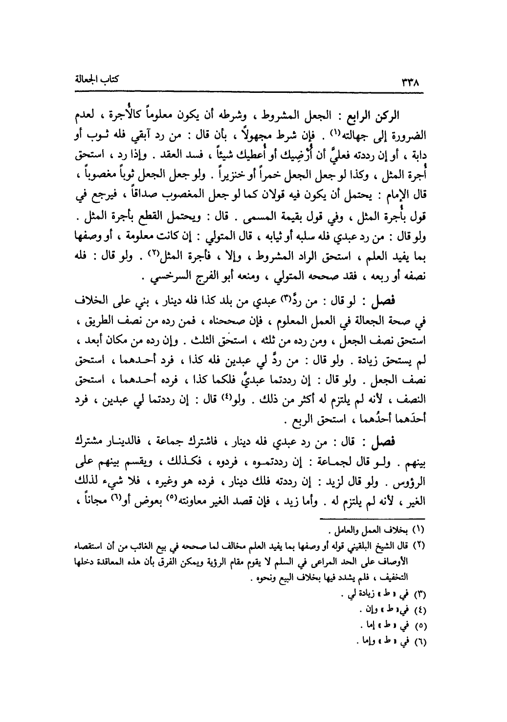 الركن الرابع : الجعل المشروط، وشرطه أن يكون معلوما كالاجرة، لعدم الضرورة إلى جهالته. فإن شرط مجهولا، بأن قال: من رد آبقي فله ثوب أو دابة، أو إن رددته فعلي أن أرضيك أو أعطيك شيئا، فسد العقد. وإذا رد، استحق أجرة المثل، وكذا لو جعل الجعل خمرا أو خنزيرا. ولو جعل الجعل ثوبا مغصوبا، قال الامام: يحتمل أن يكون فيه قولان كما لو جعل المغصوب صداقا، فيرجع في قول بأجرة المثل، وفي قول بقيمة المسمى. قال: ويحتمل القطع بأجرة المثل. ولو قال: من رد عبدي فله سلبه أو ثيابه، قال المتولي: إن كانت معلومة، أو وصفها بما يفيد العلم، استحق الراد المشروط، وإلا، فأجرة المثل. ولو قال: فله نصفه أو ربعه، فقد صححه المتولي، ومنعه أبو الفرج السرخسي. فصل لو قال: من رد لي عبدي من بلد كذا فله دينار، بني على الخلاف في صحة الجعالة في العمل المعلوم، فإن صححناها، فمن رده من نصف الطريق، استحق نصف الجعل، ومن رده من ثلثه، استحق الثلث. وإن رده من مكان أبعد، لم يستحق زيادة. ولو قال: من رد لي عبدين فله كذا، فرد أحدهما، استحق نصف الجعل. ولو قال: إن رددتما عبدي فلكما كذا، فرده أحدهما، استحق النصف، لانه لم يلتزم له أكثر من ذلك. وإن قال: إن رددتما لي عبدين، فرد أحدهما أحدهما، استحق الربع. فصل قال: من رد عبدي فله دينار، فاشترك جماعة، فالدينار مشترك بينهم. ولو قال لجماعة: إن رددتموه، فردوه، فكذلك، ويقسم بينهم على الرؤوس. ولو قال لزيد: إن رددته فلك دينار، فرده هو وغيره، فلا شئ لذلك الغير، لانه لم يلتزم له. وأما زيد، فإن قصد الغير معاونته إما بعوض وإما مجانا،