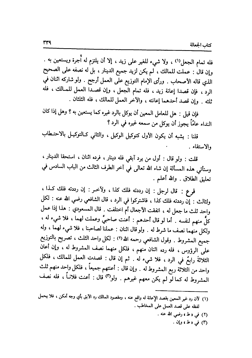 فله تمام الجعل، ولا شئ للغير على زيد، إلا أن يلتزم له أجرة ويستعين به. وإن قال: عملت للمالك، لم يكن لزيد جميع الدينار، بل له نصفه على الصحيح الذي قاله الاصحاب. ورأى الامام التوزيع على العمل أرجح. ولو شاركه إثنان في الرد، فإن قصدا إعانة زيت، فله تمام الجعل، وإن قصدا العمل للمالك، فله ثلثه. وإن قصد أحدهما إعانته، والآخر العمل للمالك، فله الثلثان. فان قيل: هل للعامل المعين أن يوكل بالرد غيره كما يستعين به ؟ وهل إذا كان النداء عاما يجوز أن يوكل من سمعه غيره في الرد ؟ قلنا: يشبه أن يكون الاول كتوكيل الوكيل، والثاني كالتوكيل بالاحتطاب والاستقاء. قلت: ولو قال: أول من يرد آبقي فله دينار، فرده إثنان، استحقا الدينار، وستأتي هذه المسألة إن شاء الله تعالى في آخر الطرف الثالث من الباب السادس في تعليق الطلاق. والله علم فرع قال لرجل: إن رددته فلك كذا، ولآخر: إن رددته فلك كذا، ولثالث: إن رددته فلك كذا، فاشتركوا في الرد، قال الشافعي رضي الله عنه: لكل واحد ثلث ما جعل له، اتفقت الاجعال أم اختلفت. قال المسعودي: هذا إذا عمل كل منهم لنفسه. أما لو قال أحدهم: أعنت صاحبي عملت لهما، فلا شئ له، ولكل منهما نصف ما شرط له. ولو قال إثنان: عملنا لصاحبنا، فلا شئ لهما، وله جميع المشروط. وقول الشافعي رضي الله عنه: لكل واحد الثلث، تصريح بالتوزيع على الرؤوس، فلو رده إثنان منهم، فلكل منهما نصف المشروط له، وإن أعان الثلاثة رابع في الرد، فلا شئ له. ثم إن قال: قصدت العمل للمالك، فلكل واحد من الثلاثة ربع المشروط له. وإن قال: أعنتهم جميعا، فلكل واحد منهم ثلث المشروط له كما لو لم يكن معهم غيرهم. وإن قال: أعنت فلانا، فله نصف