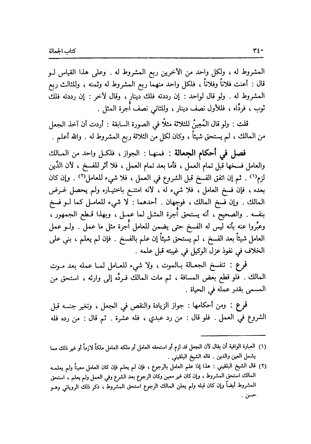 فصل في أحكام الجعالة فمنها : الجواز، فلكل واحد من المالك والعامل فسخها قبل تمجم العمل، فأما بعد تمام العمل، فلا أثر للفسخ، لان الدين لزم. ثم إن اتفق الفسخ قبل الشروع في العمل، فلا شئ للعامل. وإن كان بعده، فان فسخ العامل، فلا شئ له، لانه امتنع باختياره ولم يحصل غرض المالك. وإن فسخ المالك، فوجهان. أحدهما: لا شئ للعامل كما لو فسخ بنفسه. والصحيح، أنه يستحق أجرة المثل لما عمل، وبهذا قطع الجمهور، وعبروا عنه بأنه ليس له الفسخ حتى يضمن للعامل أجرة مثل ما عمل. ولو عمل العامل شيئا بعد الفسخ، لم يستحق شيئا إن علم بالفسخ. فان لم يعلم، بني على الخلاف في نفوذ عزل الوكيل في غيبته قبل علمه. فرع تنفسخ الجعالة بالموت، ولا شئ للعامل لما عمله بعد موت المالك. فلو قطع بعض المسافة، ثم مات المالك فرده إلى وارثه، استحق من المسمى بقدر عمله في الحياة. فرع ومن أحكامها: جواز الزيادة والنقص في الجعل، وتغير جنسه قبل الشروع في العمل. فلو قال: من رد عبدي، فله عشرة. ثم قال: من رده فله