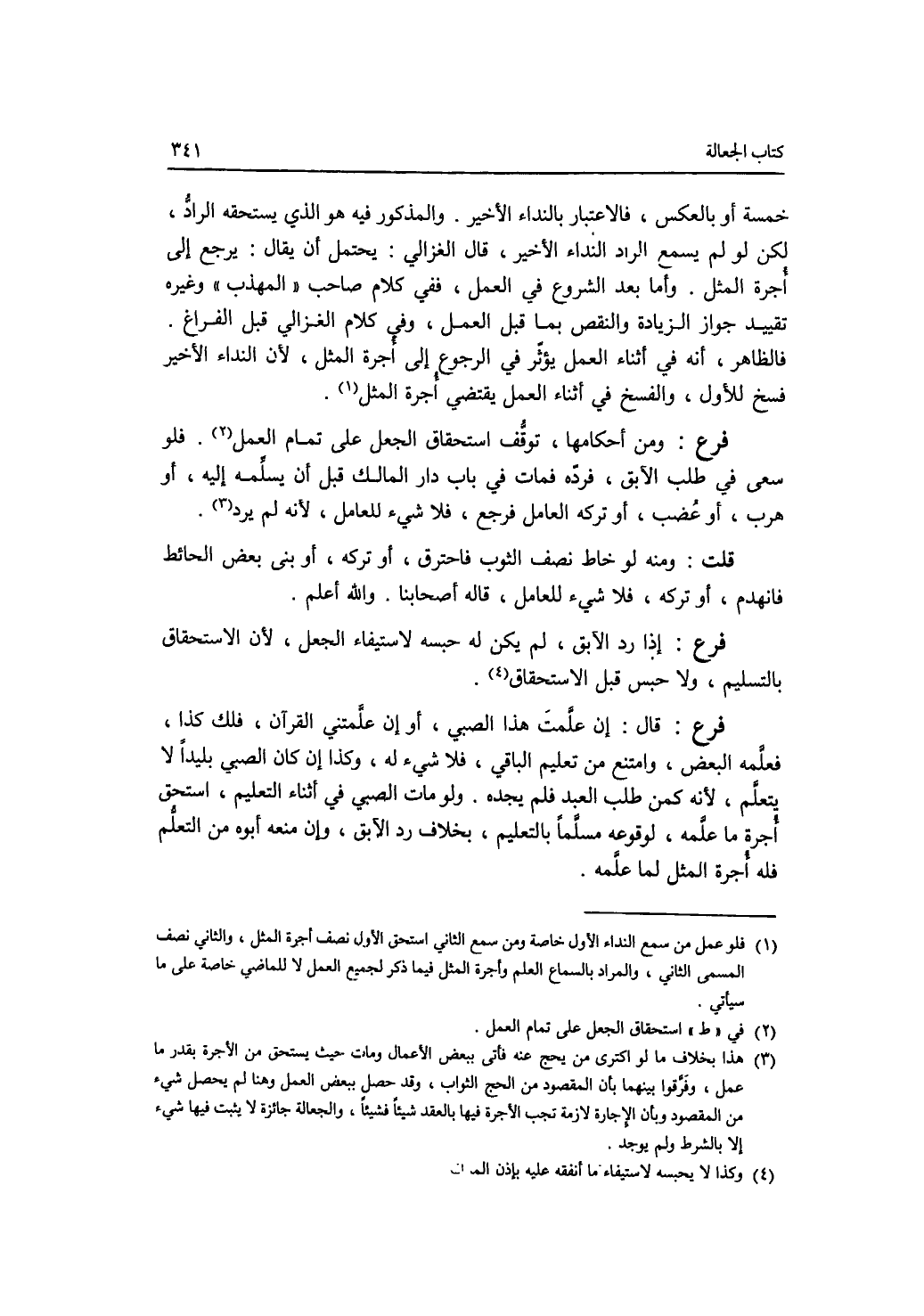 خمسة أو بالعكس، فالاعتبار بالنداء الاخير. والمذكور فيه هو الذي يستحقه الراد، لكن لو لم يسمع الراد النداء الاخير، قال الغزالي: يحتمل أن يقال: يرجع إلى أجرة المثل. وأما بعد الشروع في العمل، ففي كلام صاحب المهذب وغيره تقييد جواز الزيادة والنقص بما قبل العمل، وفي كلام الغزالي قبل الفراغ. فالظاهر، أنه في أثناء العمل يؤثر في الرجوع إلى أجرة المثل، لان النداء الاخير فسخ للاول، والفسخ في أثناء العمل يقتضي أجرة المثل. فرع ومن أحكامها، توقف استحقاق الجعل على تمام الجعل على تمام العمل. فلو سعى في طلب الآبق، فرده فمات في باب دار المالك قبل أن يسلمه إليه، أو هرب، أو عضب، أو تركه العامل فرجع، فلا شئ للعامل، لانه لم يرد. قلت: ومنه لو خاط نصف الثوب فاحترق، أو تركه، أو بنى بعض الحائط فانهدم، أو تركه، فلا شئ للعامل، قاله أصحابنا. والله أعلم فرع إذا رد الآبق، لم يكن له حبسه لاستيفاء الجعل، لان الاستحقاق بالتسليم، ولاحبس قبل الاستحقاق. فرع قال: إن علمت هذا الصبي، أو إن علمتني القرآن، فلك كذا، فعلمه البعض، وامتنع من تعليم الباقي، فلا شئ له، وكذا إن كان الصبي بليدا لا يتعلم، لانه كمن طلب العبد فلم يجده. ولو مات الصبي في أثناء التعليم، استحق أجرة ما علمه، لوقوعه مسلما بالتعليم، بخلاف رد الآبق، وإن منعه أبوه من التعلم فله أجرة المثل لما علمه.