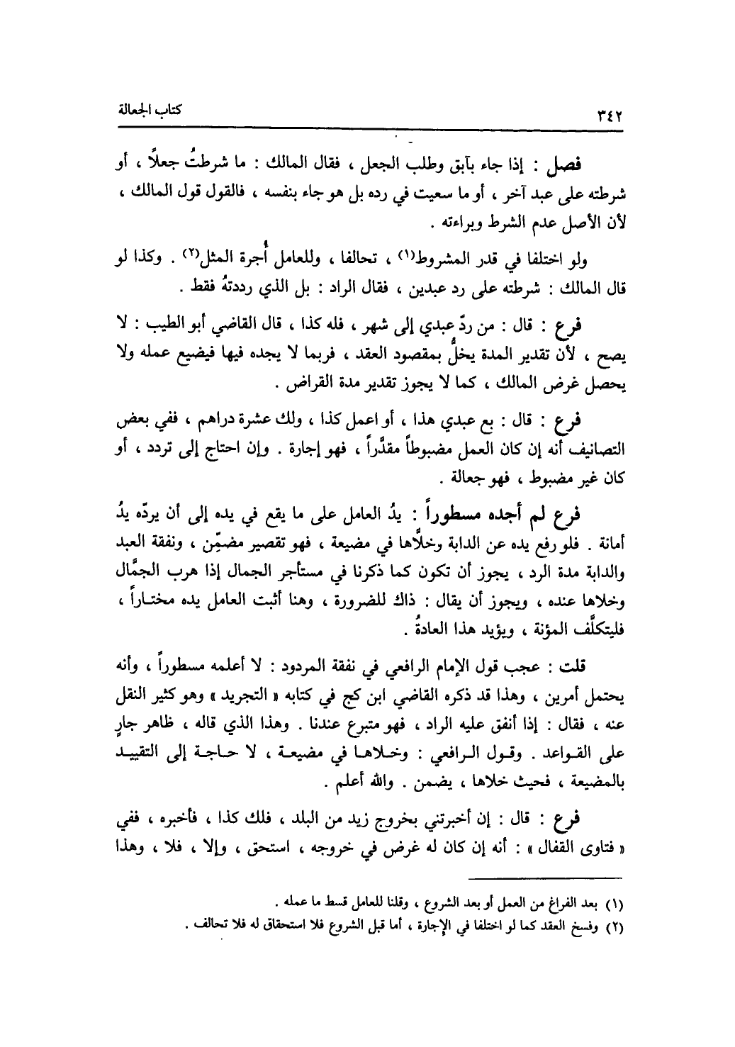 فصل إذا جاء بآبق وطلب الجعل، فقال المالك: ما شرطت جعلا، أو شرطته على عبد آخر، أو ما سعيت في رده بل هو جاء بنفسه، فالقول قول المالك، لان الاصل عدم الشرط وبراءته. ولو اختلفا في قدر المشروط، تحالفا، وللعامل أجرة المثل. وكذا لو قال المالك: شرطته على رد عبدين، فقال الراد: بل الذي رددته فقط. فرع قال: من رد عبدي إلى شهر، فله كذا، قال القاضي أبو الطيب: لا يصح، لان تقدير المدة يخل بمقصود العقد، فربما لا يجده فيها فيضيع عمله ولا يحصل غرض المالك، كما لا يجوز تقدير مدة القراض. فرع قال: بع عبدي هذا، أو إعمل كذا، ولك عشرة دراهم، ففي بعض التصانيف أنه إن كان العمل مضبطا مقدرا، فهو إجارة. وإن احتاج إلى تردد، أو كان غير مضبوط، فهو جعالة. فرع لم أجده مسطورا يد العامل على ما يقع في يده إلى أن يرده يد أمانة. فلو رفع يده عن الدابة وخلاها في مضيعة، فهو تقصير مضمن، ونفقة العبد والدابة مدة الرد، يجوز أن تكون كما ذكرنا في مستأجر الجمال إذا هرب الجمال وخلاها عنده، ويجوز أن يقال: ذاك للضرورة، وهنا أثبت العامل يده مختارا، فليتكلف المؤنة، ويؤيد هذا العادة. قلت: عجب قول الامام الرافعي في نفقة المردود: لا أعلمه مسطورا، وأنه يحتمل أمرين، وهذا قد ذكره القاضي ابن كج في كتابه التجريد وهو كثير النقل عنه، فقال: إذا أنفق عليه الراد، فهو متبرع عندنا. وهذا الذي قاله، ظاهر جار على القواعد. وقول الرافعي: وخلاها في مضيعة، لا حاجة إلى التقييد بالمضيعة، فحيث خلاها، يضمن. والله أعلم فرع قال: إن أخبرتني بخروج زيد من البلد، فلك كذا، فأخبره، ففي فتاوى القفال: أنه إن كان له غر ض في خروجه، استحق، وإلا، فلا، وهذا