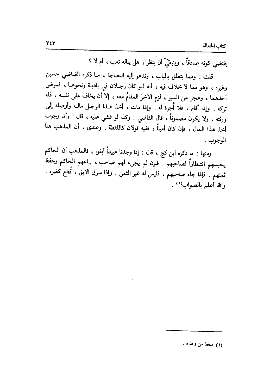 يقتضي كونه صادقا، وينبغي أن ينظر، هل يناله تعب، أم لا ؟ قلت: ومما يتعلق بالباب، وتدعو إليه الحاجة، ما ذكره القاضي حسين وغيره، وهو مما لا خلاف فيه، أنه لو كان رجلان في بادية ونحوها، فمرض أحدهما، وعجز عن السير، لزم الآخر المقام معه، إلا أن يخاف على نفسه، فله تركه. وإذا أقام، فلا أجرة له. وإذا مات، أخذ هذا الرجل ماله وأوصله إلى ورثته، ولا يكون مضمونا، قال القاضي: وكذا لو غشي عليه، قال: وأما وجوب أخذ هذا المال، فإن كان أمينا، ففيه قولان كاللقطة. وعندي، أن المذهب هنا الوجوب. ومنها: ما ذكره ابن كج، قال: إذا وجدنا عبيدا أبقوا، فالمذهب أن الحاكم يحبسهم انتظارا لصاحبهم. فان لم يجئ لهم صاحب، باعهم الحاكم وحفظ ثمنهم. فإذا جاء صاحبهم، فليس له غير الثمن. وإذا سرق الآبق، قطع كغيره. والله علم