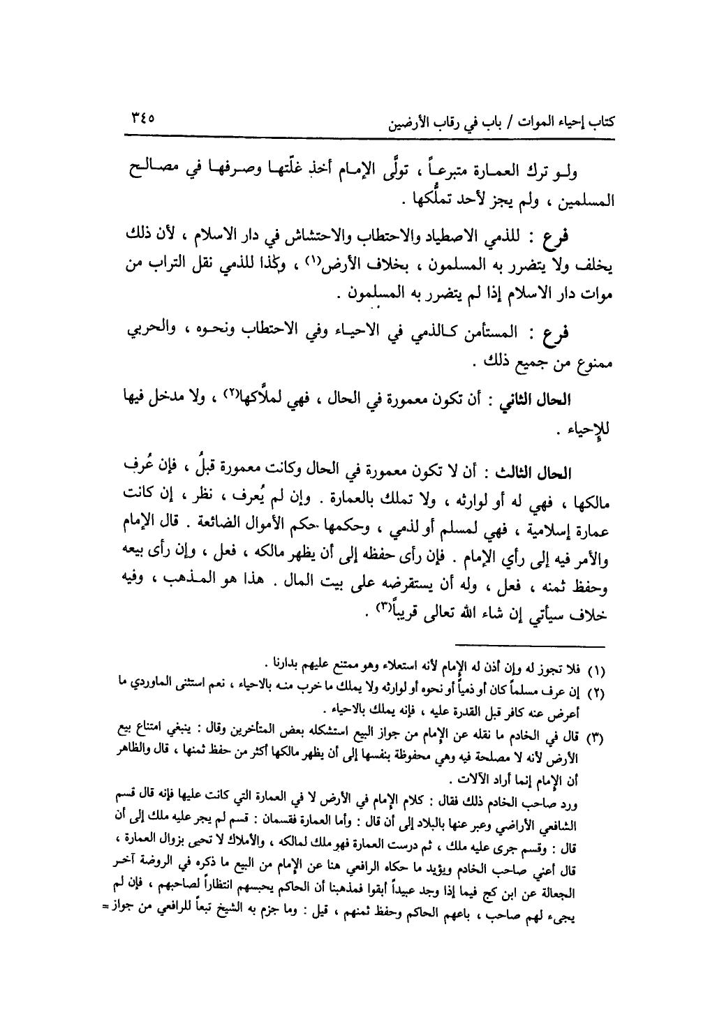 ولو ترك العمارة متبرعا، تولى الامام أخذ غلتها وصرفها في مصالح المسلمين، ولم يجز لاحد تملكها. فرع للذمي الاصطياد والاحتطاب والاحتشاش في دار الاسلام، لان ذلك يخلف، ولا يتضرر به المسلمون، بخلاف الارض، وكذا للذمي نقل التراب من موات دار الاسلام إذا لم يتضرر به المسلمون. فرع المستأمن كالذمي في الاحياء وفي الاحتطاب ونحوه، و الحربي ممنوع من جميع ذلك. الحال الثاني: أن تكون معمورة في الحال، فهي لملاكها، ولا مدخل فيها للاحياء. الحال الثالث: أن لا تكون معمورة في الحال وكانت معمورة قبل، فإن عرف مالكها، فهي له أو لوارثه، ولا تملك بالعمارة. وإن لم يعرف، نظر، إن كانت عمارة إسلامية، فهي لمسلم أو لذمي، وحكمها حكم الاموال الضائعة. قال الامام: والامر فيه إلى رأي الامام. فإن رأى حفظه إلى أن يظهر مالكه، فعل، وإن رأى بيعه وحفظ ثمنه، فعل، وله أن يستقرضه على بيت المال. هذا هو المذهب، وفيه خلاف سيأتي إن شاء الله تعالى قريبا.