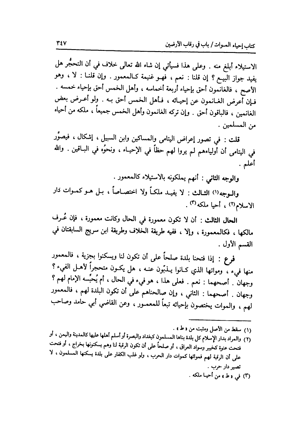الاستيلاء أبلغ منه. وعلى هذا فسيأتي إن شاء الله تعالى خلاف في أن التحجر (هل) يفيد جواز البيع ؟ إن قلنا: نعم، فهو غنيمة كالمعمور. وإن قلنا: لا، وهو الاصح، فالغانمون أحق بإحياء أربعة أخماسه، وأهل الخمس أحق بحياء خمسه. فإن أعرض الغانمون عن إحيائه، فأهل الخمس أحق به. ولو أعرض بعض الغانمين، فالباقون أحق. وإن تركه الغانمون وأهل الخمس جميعا، ملكه من أحياه من المسلمين. قلت: في تصور إعراض اليتامى والمساكين وابن السبيل، إشكال، فيصور في اليتامى أن أولياءهم لم يروا لهم حظا في الاحياء، ونحوه في الباقين. والله أعلم والوجه الثاني: أنهم يملكونه بالاستيلاء كالمعمور. والوجه الثالث: لا يفيد ملكا ولا اختصاصا، بل هو كموات دار الاسلام، من أحياه ملكه. الحال الثالث: أن لا تكون معمورة في الحال وكانت معمورة، فإن عرف مالكها، فكالمعمورة، وإلا، ففيه طريقة الخلاف وطريقة ابن سريج السابقتان في القسم الاول. فرع إذا فتحنا بلدة صلحا على أن تكون لنا ويسكنوا بجزية، فالمعمور منها فئ، ومواتها الذي كانوا يذبون عنه، هل يكون متحجرا لاهل الفئ ؟ وجهان. أصحهما: نعم. فعلى هذا، هو فئ في احال، أم يحبسه الامام لهم ؟ وجهان. أصحهما: الثاني، وإن صالحناهم على أن تكون البلدة لهم، فالمعمور لهم، والموا ت يختصون بإحيائه تبعا للمعمور، وعن القاضي أبي حامد وصاحب