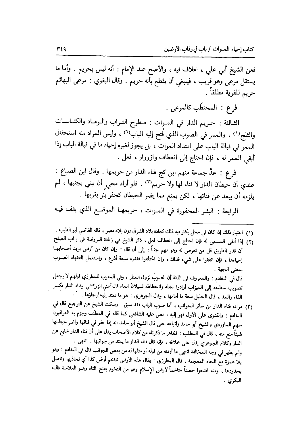 فعن الشيخ أبي علي، خلاف فيه، والاصح عند الامام: أنه ليس بحريم. وأما ما يستقل مرعى وهو قريب، فينبغي أن يقطع بأنه حريم. وقال البغوي: مرعى البهائم حريم للقرية مطلقا. فرع المحتطب كالمرعى. الثالثة: حريم الدار في الموات: مطرح التراب والرماد والكناسات والثلج، والممر في الصوب الذي فتح إليه الباب، وليس المراد منه استحقاق الممر في قبالة الباب على امتداد الموات، بل يجوز لغيره إحياء ما في قبالة الباب إذا أبقي الممر له، فان احتاج إلى انعطاف وازورار، فعل. فرع عد جماعة منهم ابن كج فناء الدار من حريمها. وقال ابن الصباغ: عندي أن حيطان الدار لا فناء لها ولا حريم. فلو أراد محي أن يبني بجنبها، لم يلزمه أن يبعد عن فنائها، لكن يمنع مما يضر الحيطان كحفر بئر بقربها. الرابعة: البئر المحفورة في الموات، حريمها الموضع الذي يقف فيه