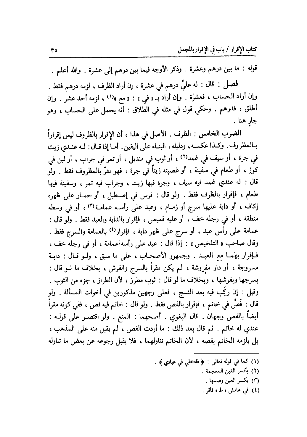 قوله: ما بين درهم وعشرة. وذكر الاوجه فيما بين درهم إلى عشرة. والله أعلم. فصل قال: له علي درهم في عشرة، إن أراد الظرف، لزمه درهم فقط. وإن أراد الحساب، فعشرة. وإن أراد بفي: مع، لزمه أحد عشر. وإن أطلق، فدرهم. وحكي قول في مثله في الطلاق: أنه يحمل على الحساب، وهو جار هنا. الضرب الخامس: الظرف. الاصل في هذا، أن الاقرار بالظروف ليس إقرارا بالمظروف. وكذا عكسه، ودليله، البناء على اليقين. أما إذا قال: له عندي زيت في جرة، أو سيف في غمد، أو ثوب في منديل، أو تمر في جراب، أو لبن في كوز، أو طعام في سفينة، أو غصبته زيتا في جرة، فهو مقر بالمظروف فقط. ولو قال: له عندي غمد فيه سيف، وجرة فيها زيت، وجراب فيه تمر، وسفينة فيها طعام، فاقرار بالظرف فقط. ولو قال: فرس فإصطبل، أو حمار على ظهره إكاف، أو دابة عليها سرج أو زمام، وعبد على رأسه عمامة، أو في وسطه منطقة، أو في رجله خف، أو عليه قميص، فاقرار بالدابة والعبد فقط. ولو قال: عمامة على رأس عبد، أو سرج على ظهر دابة، فاقرار بالعمامة والسرج فقط. وقال صاحب التلخيص: إذا قال: عبد على رأسه عمامة، أوفي رجله خف، فاقرار بهما مع العبد. وجمهور الاصحاب، على ما سبق. ولو قال: دابة مسروجة، أو دار مفروشة، لم يكن مقرا بالسرج والفرش، بخلاف ما لو قال: بسرجها وبفرشها، وبخلاف ما لو قال: ثوب مطرز، لان الطراز، جزء من الثوب. وقيل: إن ركب فيه بعد النسج، فعلى وجهين مذكورين في أخوات المسألة. ولو قال: فص في خاتم، فإقرار بالفص فقط، ولو قال: خاتم فيه فص ففي كونه مقرا أيضا بالفص وجهان. قال البغوي. أصحهما: المنع. ولو اقتصر على قوله: عندي له خاتم. ثم قال بعد ذلك: ما أردت الفص، لم يقبل منه على المذهب، بل يلزمه الخاتم بفصه، لان الخاتم تناولهما، فلا يقبل رجوعه عن بعض ما تناوله