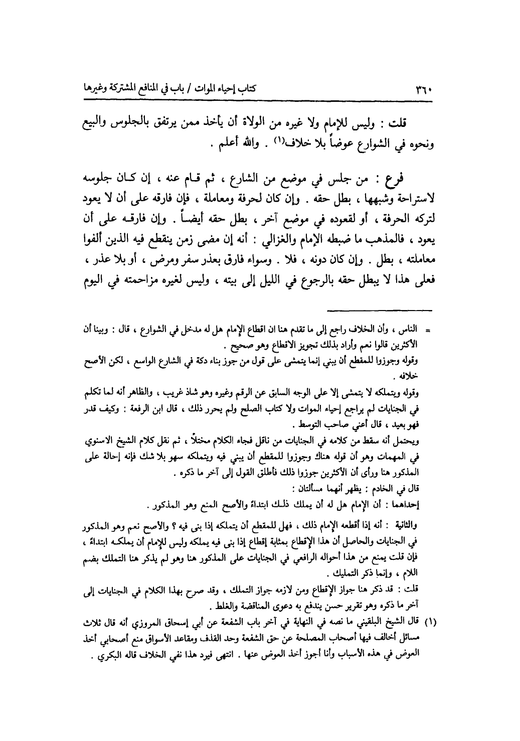 قلت: وليس للامام ولا غيره من الولاة أن يأخذ ممن يرتفق بالجلوس والبيع ونحوه في الشوارع عوضا بلا خلاف. والله علم فرع من جلس في موضع من الشارع، ثم قام عنه، إن كان جلوسه لاستراحة وشبهها، بطل حقه. وإن كان لحرفة ومعاملة، فان فارقه على أن لا يعود لتركه الحرفة، أو لقعوده في موضع آخر، بطل حقه أيضا. وإن فارقه على أن يعود فالمذهب ما ضبطه الامام والغزالي: أنه إن مضى زمن ينقطع فيه الذين ألفوا معاملته، بطل. وإن كان دونه، فلا. وسواء فارق بعذر سفر ومرض، أو بلا عذر، فعلى هذا لا يبطل حقه بالرجوع في الليل إلى بيته، وليس لغيره مزاحمته في اليوم