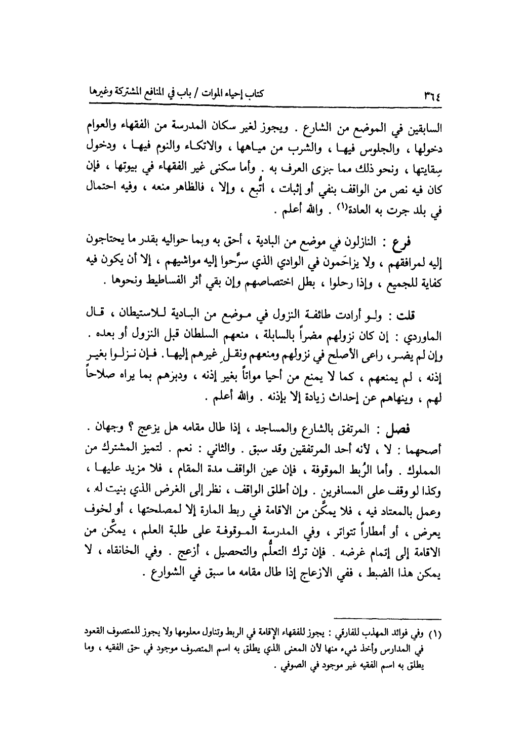 السابقين في الموضع من الشارع. ويجوز لغير سكان المدرسة من الفقهاء والعوام دخولها، والجلوس فيها، والشرب من مياهها، والاتكاء والنوم فيها، ودخول سقايتها، ونحو ذلك مما جرى العرف به. وأما سكنى غير الفقهاء في بيوتها، فان كان فيه نص من الواقف بنفي أو إثبات، اتبع، وإلا، فالظاهر منعه، وفيه احتمال في بلد جرت به العادة. والله أعلم فرع النازلون في موضع من البادية، أحق به وبما حواليه بقدر ما يحتاجون إليه لمرافقهم، ولا يزاحمون في الوادي الذي سرحوا إليه مواشيهم، إلا أن يكون فيه كفاية للجميع، وإذا رحلوا، بطل اختصاصهم وإن بقي أثر الفساطيط ونحوها. قلت: ولو أرادت طائفة النزول في موضع من البادية للاستيطان، قال الماوردي: إن كان نزولهم مضرا بالسابلة، منعهم السلطان قبل النزول أو بعده. وإن لم يضر، راعى الاصلح في نزولهم ومنعهم ونقل غيرهم إليها. فان نزلوا بغير إذنه، لم يمنعهم، كما لا يمنع من أحيا مواتا بغير إذنه، ودبرهم بما يراه صلاحا لهم، وينهاهم عن إحداث زيادة إلا بإذنه. والله أعلم.