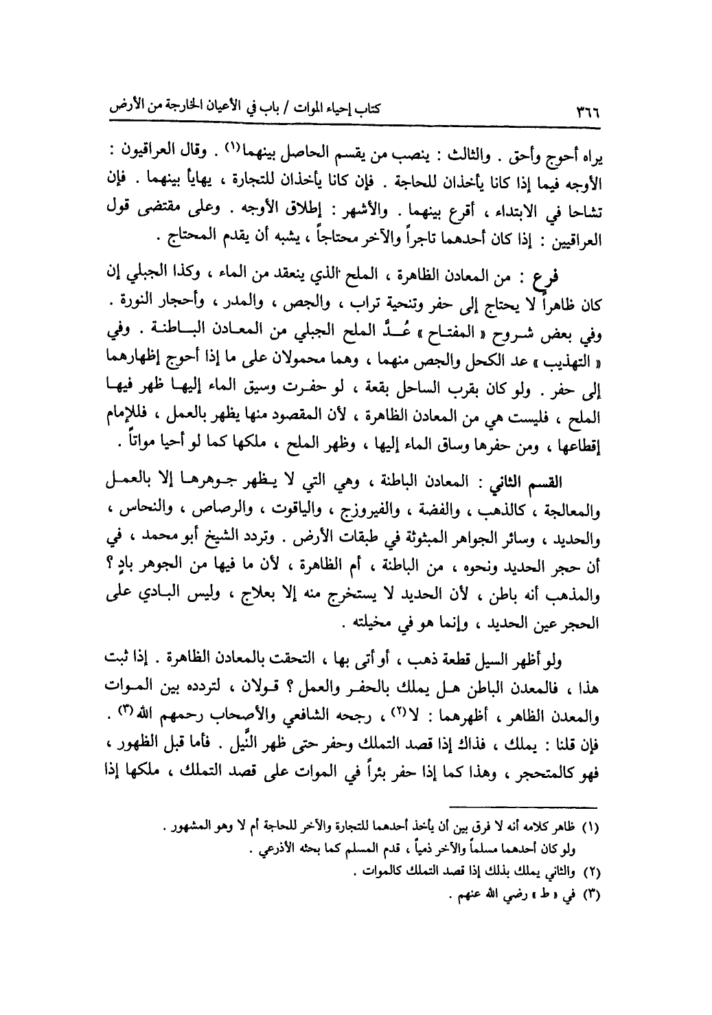 يراه أحوج وأحق. والثالث: ينصب من يقسم الحاصل بينهما. وقال العراقيون: الاوجه فيما إذا كانا يأخذان للحاجة. فإن كانا يأخذان للتجارة، يهايأ بينهما. فإن تشاحا في الابتداء، أقرع بينهما. والاشهر: إطلاق الاوجه. وعلى مقتضى قول العراقيين: إذا كان أحدهما تاجرا والآخر محتاج، يشبه أن يقدم المحتاج. فرع من المعادن الظاهرة، الملح الذي ينعقد من الماء، وكذا الجبلي إن كان ظاهرا لا يحتاج إلى حفر وتنحية تراب، والجص، والمدر، وأحجار النورة. وفي بعض شروح المفتاح عد الملح الجبلي من المعادن الباطنة. وفي التهذيب عد الكحل والجص منهما، وهما محمولان على ما إذا أحوج إظهارهما إلى حفر. ولو كان بقرب الساحل بقعة، لو حفرت وسيق الماء إليها ظهر فيها الملح، فليست هي من المعادن الظاهرة، لان المقصود منها يظهر بالعمل، فللامام إقطاعها، ومن حفرها وساق الماء إليها، وظهر الملح، ملكها كما لو أحيا مواتا. القسم الثاني: المعادن الباطنة، وهي التي لا يظهر جوهرها إلا بالعمل والمعالجة، كالذهب، والفضة، والفيروزج، والياقوت، والرصاص، والنحاس، والحديد، وسائر الجواهر المبثوثة في طبقات الارض. وتردد الشيخ أبو محمد، في أن حجر الحديد ونحوه، من الباطنة، أم الظاهرة، لان ما فيها من الجوهر باد ؟ والمذهب أنه باطن، لان الحديد لا يستخرج منه إلا بعلاج، وليس البادي على الحجر عين الحديد، وإنما هو في مخيلته. ولو أظهر السيل قطعة ذهب، أو أتى بها، التحقت بالمعادن الظاهرة. إذا ثبت هذا، فالمعدن الباطن هل يملك بالحفر والعمل ؟ قولان، لتردده بين الموات والمعدن الظاهر، أظهرهما: لا، رجحه الشافعي والاصحاب رضي الله عنهم. فإن قلنا: يملك، فذاك إذا قصد التملك وحفر حتى ظهر النيل. فأما قبل الظهور، فهو كالمتحجر، وهذا كما إذا حفر بئرا في الموا ت على قصد التملك، ملكها إذا