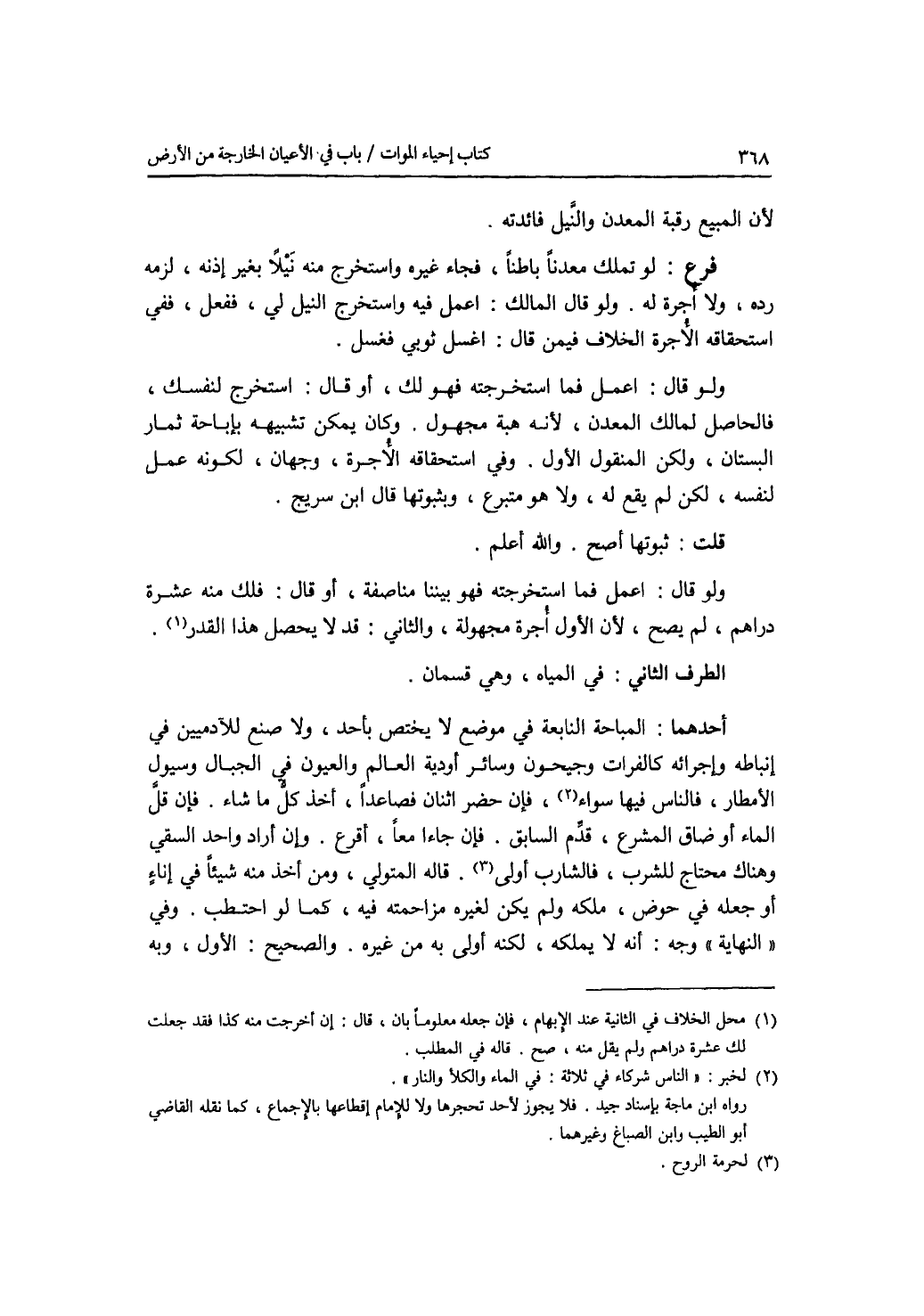 الطرف الثاني : في المياه، وهي قسمان. أحدهما: المباحة النابعة في موضع لا يختص بأحد، ولا صنع للآدميين في إنباطه وإجرائه كالفرات وجيحون وسائر أودية العالم والعيون في الجبال وسيول الامطار، فالناس فيها سواء، فإن حضر اثنان فصاعدا، أخذ كل ما ش اء. فإن قل الماء أو ضاق المشرع، قدم السابق. فإن جاءا معا، أقرع. وإن أراد واحد السقي وهناك محتاج للشرب، فالشارب أولى. قاله المتولي، ومن أخذ منه شيئا في إناء أو جعله في حوض، ملكه ولم يكن لغيره مزاحمته فيه، كما لو احتطب. وفي النهاية وجه: أنه لا يملكه، لكنه أولى به من غيره. والصحيح: الاول، وبه
