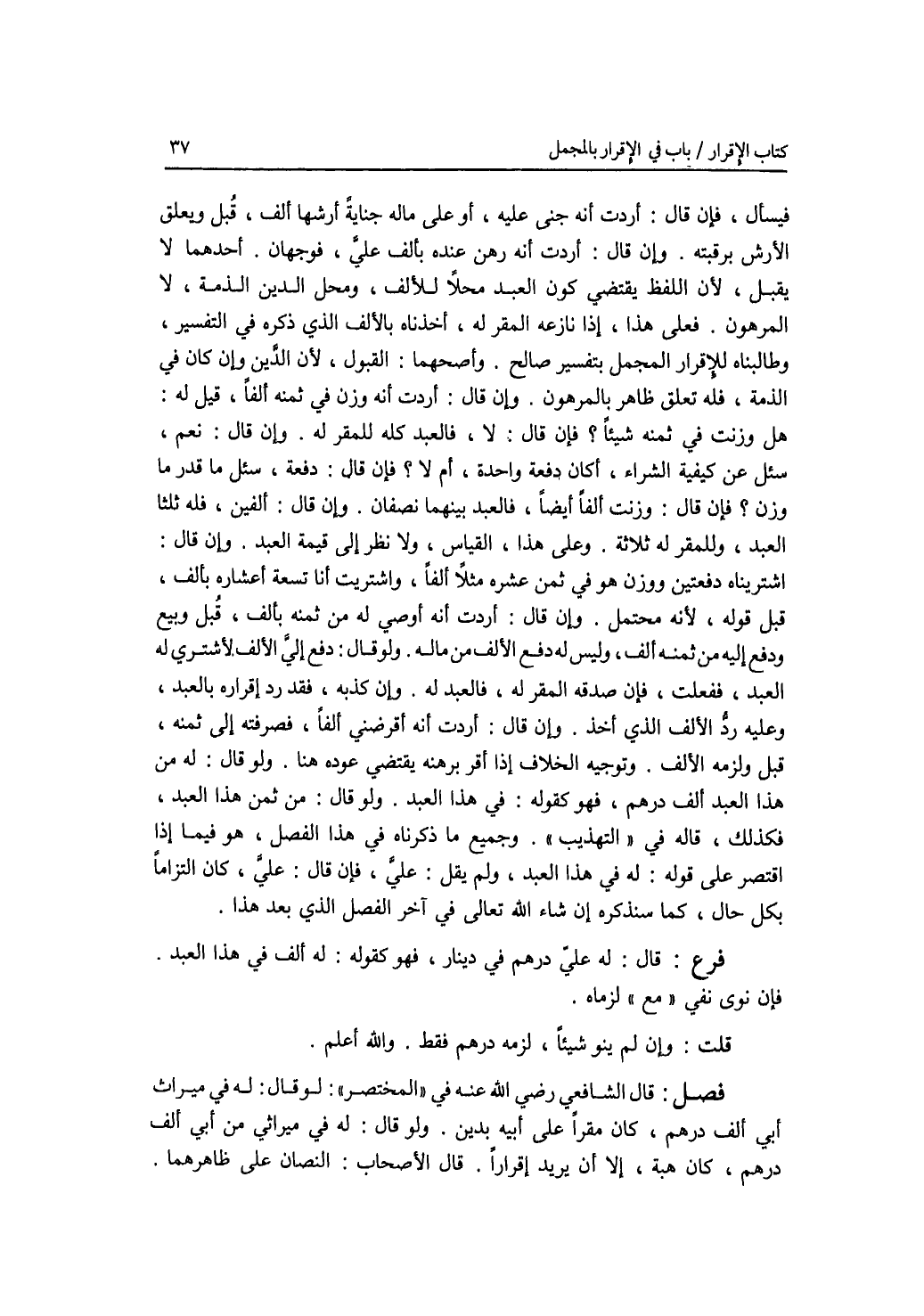 فيسأل، فإن قال: أردت أنه جني عليه، أو على ماله جناية أرشها ألف، قبل ويعلق الارش برقبته. وإن قال: أردت أنه رهن عنده بألف علي، فوجهان. أحدهما: لا يقبل، لان اللفظيقتضي كون العبد محلا للالف، ومحل الدين الذمة، لا المرهون. فعلى هذا، إذا نازعه المقر له، أخذناه بالالف الذي ذكره في التفسير، وطالبناه للاقرار المجم بتفسير صالح. وأصحهما: القبول، لان الدين وإن كان في الذمة، فله تعلق ظاهر بالمرهون. وإن قال: أردت أنه وزن في ثمنه ألفا، قيل له: هل وزنت في ثمنه شيئا ؟ فإن قال: لا، فالعبد كله للمقر له. وإن قال: نعم، سئل عن كيفية الشراء، أكان دفعة واحدة، أم لا ؟ فإن قال: دفعة، سئل ما قدر ما وزن ؟ فإن قال: وزنت ألفا أيضا، فالعبد بينهما نصفان. وإن قال: ألفين، فله ثلثا العبد، وللمقر له ثلاثة. وعلى هذا، القياس، ولا نظر إلى قيمة العبد. وإن قال: اشتريناه دفعتين ووزن هو في ثمن عشره مثلا ألفا، واشتريت أنا تسعة أعشاره بألف، قبل قوله، لانه محتمل. وإن قال: أردت أنه أوصي له من ثمنه بألف، قبل وبيع ودفع إليه من ثمنه ألف، وليس له دفع الالف من ماله. ولو قال: دفع إلي الالف لاشتري له العبد، ففعلت، فإن صدقه المقر له، فالعبد له. وإن كذبه، فقد رد إقراره بالعبد، وعليه رد الالف الذي أخذ. وإن قال: أردت أنه أقرضني ألفا، فصرفته إلى ثمنه، قبل ولزمه الالف. وتوجيه الخلاف إذا أقر برهنه يقتضي عوده هنا. ولو قال: له من هذا العبد ألف درهم، فهو كقوله: في هذا العبد. ولو قال: من ثمن هذا العبد، فكذلك، قاله في التهذيب. وجميع ما ذكرناه في هذا الفصل، هو فيما إذا اقتصر على قوله: (له) في هذا العبد، ولم يقل: علي، فإن قال: علي، كان التزاما بكل حال، كما سنذكره إن شاء الله تعالى في آخر الفصل الذي بعد هذا. فرع قال: له علي درهم في دينار، فهو كقوله: له ألف في هذا العبد. فإن نوى نفي مع، لزماه. قلت: وإن لم ينو شيئا، لزمه درهم فقط. والله أعلم. فصل قال الشافعي رضي الله عنه في المختصر: لو قال: له في ميرا ث أبي ألف درهم، كان مقرا على أبيه بدين. ولو قال: له في ميراثي من أبي ألف درهم، كان هبة، إلا أن يريد إقرارا. قال الاصحاب: النصان على ظاهرهما.
