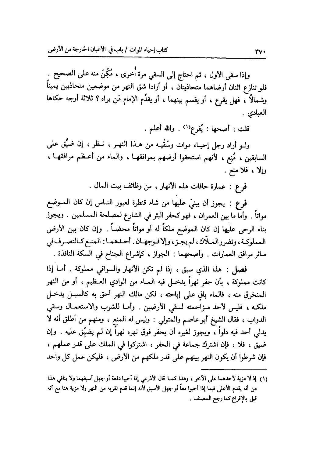 مإذا سقى الاول، ثم احتاج إلى السقي مرة أخرى، مكن منه على الصحيح فلو تنازع اثنان أرضاهما متحاذيتان، أو أرادا شق النهر من موضعين متحاذيين يمينا وشمالا، فهل يقرع، أو يقسم بينهما، أو يقدم الامام من يراة ؟ فيه ثلاثة أوجه حفاها العبادي. قلت: أصحها: يقرع. والله أعلم ولو أراد رجل إحياء موات وسقيه من هذا النهر، نظر، إن ضيق على السابقين، منع، لانهم استحقوا أرضهم بمرافقها، والماء من أعظم مرافقها، وإلا، فلا منع. فرع عمارة حافات هذه الانهار، من وظائف بيت المال. فرع يجوز أن يبني عليها من شاء قنطرة لعبور الناس إن كان الموضع مواتا. وأما (ما) بين العمران، فهو كحفر البئر في الشارع لمصلحة المسلمين. ويجوز بناء الرحى عليها إن كان الموضع ملكا له أو مواتا محضا. وإن كان بين الارض المملوكة، وتضرر الملاك، لم يجز، وإلا، فوجهان. أحدهما: المنع كالتصرف في سائر مرافق العمارات. وأصحهما: الجواز، كاشراع الجناح في السكة النافذة.