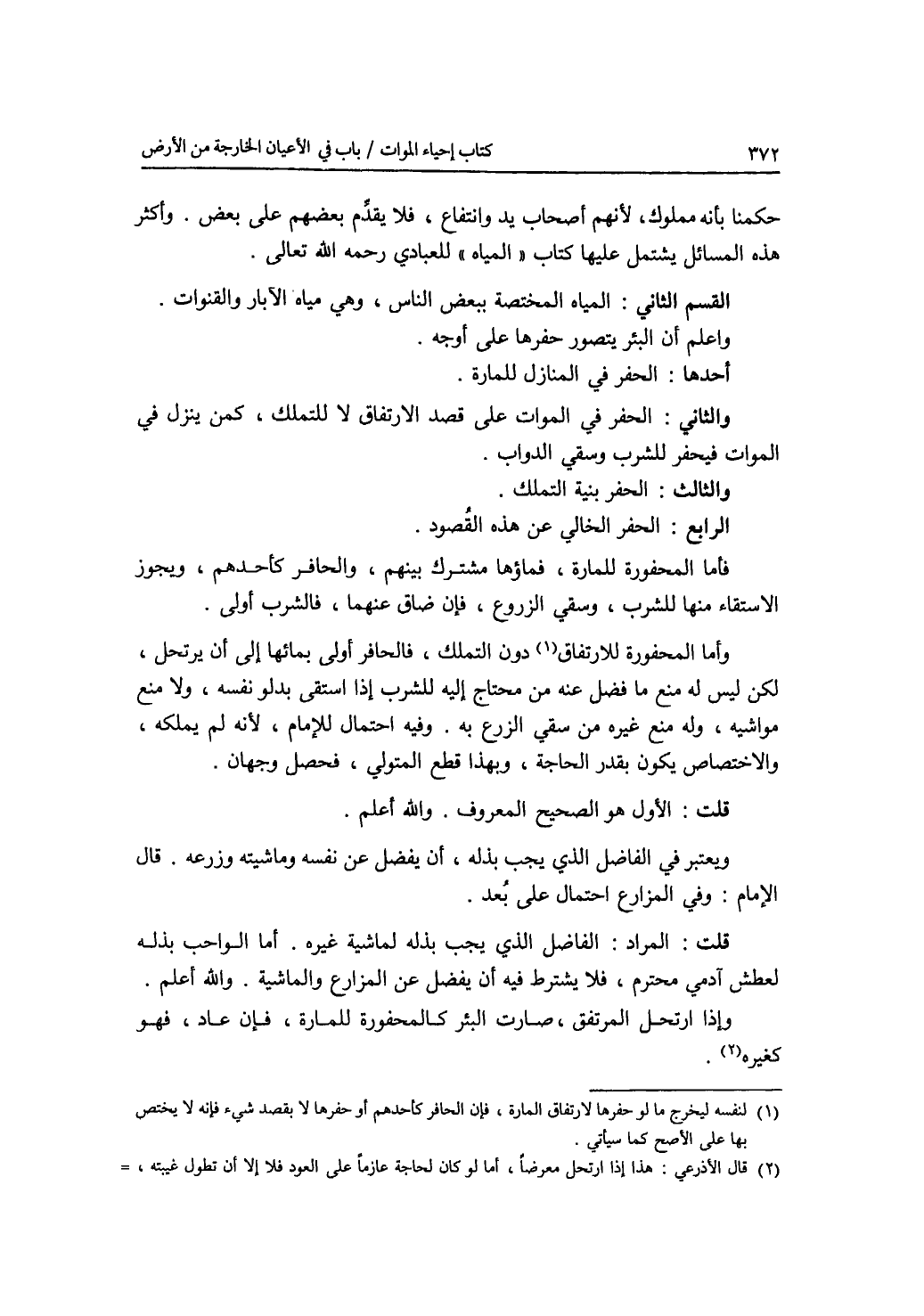 حكمنا بأنه مملوك، لانهم أصحاب يد وانتفاع، فلا يقدم بعضهم على بعض. وأكثر هذه المسائل يشتمل عليها كتاب المياه للعبادي رحمه الله تعالى. القسم الثاني: المياه المختصة ببعض الناس، وهي مياه الآبار والقنوات. واعلم أن البئر يتصور حفرها على أوجه. أحدها: الحفر في المنازل للمارة. والثاني: الحفر في الموات على قصد الارتفاق لا للتملك، كمن ينزل في الموات فيحفر للشر ب وسقي الدواب. والثالث: الحفر بنية التملك. والرابع: الحفر الخالي عن هذه القصود. فأما المحفورة للمارة، فماؤها مشترك بينهم، والحافر كأحدهم، ويجو الاستقاء منها للشرب، وسقي الزروع، فان ضاق عنهما، فالشرب أولى. وأما المحفورة للارتفاق دون التملك، فالحافر أولى بمائها إلى أن يرتحل، لكن ليس له منع ما فضل عنه عن محتاج إليه للشرب إذا استقى بدلو نفسه، ولا منع مواشيه، وله منع غيره من سقي الزرع به. وفيه احتمال للامام، لانه لم يملكه، والاختصاص يكون بقدر الحاجة، وبهذا قطع المتولي، فحصل وجهان. قلت: الاول هو الصحيح المعروف. والله أعلم ويعتبر في الفاضل الذي يجب بذله، أن يفضل عن نفسه وماشيته وزرعه. قال الامام: وفي المزارع احتمال على بعد. قلت: المراد: الفاضل الذي يجب بذله لماشية غيره. أما الواجب بذله لعطش آدمي محترم، فلا يشترط فيه أن يفضل عن المزارع والماشية. والله أعلم وإذا ارتحل المرتفق، صارت البئر كالمحفورة للمارة، فان عاد، فهو كغيره.