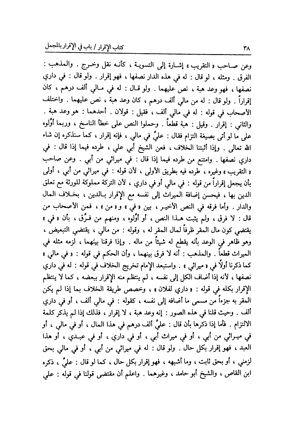 وعن صاحب التقريب إشارة إلى التسوية، كأنه نقل وخرج. والمذهب: الفرق. ومثله، لو قال: له في هذه الدار نصفها، فهو إقرار. ولو قال: في داري نصفها، فهو وعد هبة، نص عليهما. ولو قال: له في مالي ألف درهم، كان إقرارا. ولو قال: له من مالي ألف درهم، كان وعد هبة، نص عليهما. واختلف الاصحاب في قوله: له في مالي ألف، فقيل: قولان. أحدهما: هو وعد هبة. والثاني: إقرار. وقيل: هبة قطعا. وحملوا النص على خطأ الناسخ، وربما أولوه على ما لو أتى بصيغة التزام فقال: علي في مالي، فإنه إقرار، كما سنذكره إن شاء الله تعالى. وإذا أثبتنا الخلاف، فعن الشيخ أبي علي، طرده فيما إذا قال: في داري نصفها. وامتنع من طرده فيما إذا قال: في ميراثي من أبي. وعن صاحب التقريب وغيره، طرده فيه بطريق الاولى، لان قوله: في ميراثي من أبي، أولى بأن يجعل إقرارا من قوله: في مالي أو في داري، لان التركة مملوكة للورثة مع تعلق الدين بها، فيحسن إضافة الميراث إلى نفسه مع الاقرار بالدين، بخلاف المال والدار. وأما فرقه في النص الاخير، بين في ومن، فمن الاصحاب من قال: لا فرق، ولم يثبت هذا النص، أو أولوه، ومنهم من فرق، بأن في يقتضي كون مال المقر ظرفا لمال المقر له، وقوله: من ما لي، يقتضي التبعيض، وهو ظاهر في الوعد بأنه يقطع له شيئا من ماله. وإذا فرقنا بينهما، لزمه مثله في الميراث قطعا. والمذهب: أنه لا فرق بينهما، وأن الحكم في قوله: في مالي كما ذكرنا أولا في ميراثي. واستبعد الامام تخريج الخلاف في قوله: له في داري نصفها، لانه إذا أضاف الكل إلى نفسه، لم ينتظم منه الاقرار ببعضه، كما لا ينتظم الاقرار بكله في قوله: داري لفلان، وخصص طريقة الخلاف بما إذا لم يكن المقر به جزءا من مسمى ما أضافه إلى نفسه، كقوله: في مالي ألف، أو في داري ألف. وحيث قلنا في هذه الصور: إنه وعد هبة، لا إقرار، فذلك إذا لم يذكر كلمة الالتزام فأما إذا ذكرها بأن قال: علي ألف درهم في هذا المال، أو في مالي، أو في ميراثي من أبي، أو في ميراث أبي، أو في داري، أو في عبدي، أو هذا العبد، فهو إقرار بكل حال. ولو قال: له في ميراث من أبي، أو في مالي بحق لزمني. أو بحق ثابت، وما أشبهه، فهو إقرار بكل حال، كما لو قال: علي، ذكره ابن القاص، والشيخ أبو حامد، وغيرهما. واعلم أن مقتضى قولنا في قوله: علي