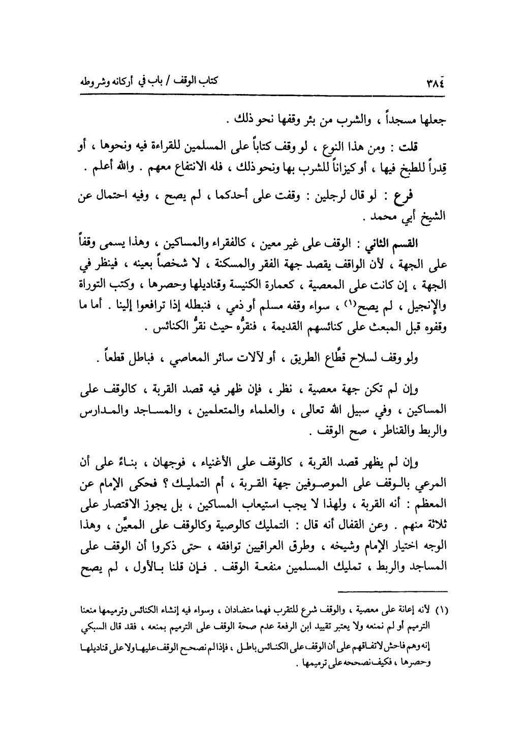 جعلها مسجدا، والشرب من بئر وقفها ونحو ذلك. قلت: ومن هذا النوع، لو وقف كتابا على المسلمين للقراءة فيه ونحوها، أو قدرا للطبخ فيها، أو كيزانا للشرب بها ونحو ذلك، فله الانتفاع معهم. والله أعلم فرع لو قال لرجلين: وقفت على أحدكما، لم يصح، وفيه احتمال عن الشيخ أبي محمد. القسم الثاني: الوقف على غير معين، كالفقراء والمساكين، وهذا يسمى وقفا على الجهة، لان الواقف يقصد جهة الفقر والمسكنة، لا شخصا بعينه، فينظر في الجهة، إن كانت على المعصية، كعمارة الكنيسة وقناديلها وحصرها، وكتب التوراة والانجيل، لم يصح، سواء وقفه مسلم أو ذمي، فنبطله إذا ترافعوا إلينا. أما ما وقفوه قبل المبعث على كنائسهم القديمة، فنقره حيث نقر الكنائس. ولو وقف لسلاح قطاع الطريق، أو لآلات سائر المعاصي، فباطل قطعا. وإن لم تكن جهة معصية، نظر، فإن ظهر فيه قصد القربة، كالوقف على المساكين، وفي سبيل الله تعالى، والعلماء والمتعلمين، والمساجد والمدارس والربط والقناطر، صح الوقف. وإن لم يظهر القربة، كالوقف على الاغنياء، فوجهان، بناء على أن المرعي بالوقف على الموصوفين جهة القربة، أم التمليك ؟ فحكى الامام عن المعظم: أنه القربة، ولهذا لا يجب استيعاب المساكين، بل يجوز الاقتصار على ثلاثة منهم. وعن القفال أنه قال: التمليك كالوصية وكالوقف على المعين، وهذا الوجه اختيار الامام وشيخه، وطرق العراقيين توافقه، حتى ذكروا أن الوقف على المساجد والربط، تمليك المسلمين منفعة الوقف. فإن قلنا بالاول، لم يصح