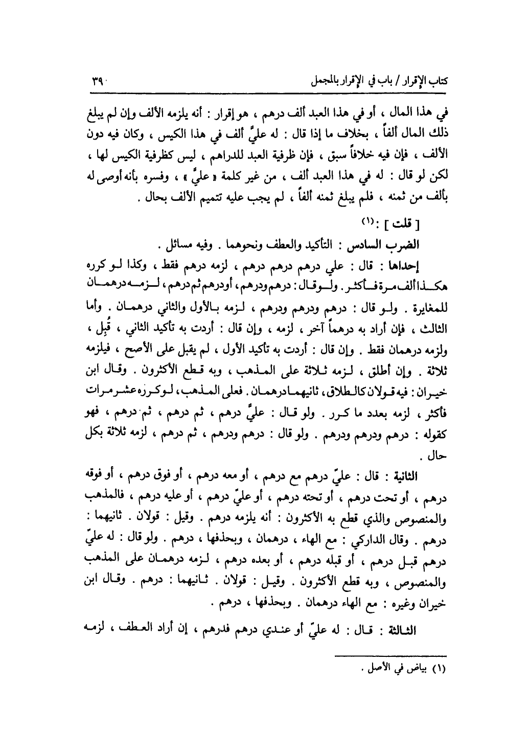 في هذا المال، أو في هذا العبد ألف درهم، هو إقرار: أنه يلزمه الالف وإن لم يبلغ ذلك المال ألفا، بخلاف ما إذا قال: له علي ألف في هذا الكيس، وكان فيه دون الالف، فإن فيه خلافا سبق، فإن ظرفية العبد للدراهم، ليست كظرفية الكيس لها، لكن لو قال: له في هذا العبد ألف، من غير كلمة علي، وفسره بأنه أوصى له بألف من ثمنه، فلم يبلغ ثمنه ألفا، لم يجب عليه تتميم الالف بحال. قلت: الضرب السادس: التأكيد والعطف ونحوهما. وفيه مسائل. إحداها: قال: علي درهم درهم درهم، لزمه درهم فقط، وكذا لو كرره هكذا ألف مرة فأكثر. ولو قال: درهم ودرهم، أو درهم ثم درهم، لزمه درهمان للمغايرة. ولو قال: درهم ودرهم ودرهم، لزمه بالاول والثاني درهمان. وأما الثالث، فإن أراد به درهما آخر، لزمه، وإن قال: أردت به تأكيد الثاني، قبل، ولزمه درهمان فقط. وإن قال: أردت به تأكيد الاول، لم يقبل على الاصح، فيلزمه ثلاثة. وإن أطلق، لزمه ثلاثة على المذهب، وبه قطع الاكثرون. وقال ابن خيران: فيه قولان كالطلاق، ثانيهما درهمان. فعلى المذهب، لو كرره عشر مرات فأكثر، لزمه بعدد ما كرر. ولو قال: علي درهم، ثم درهم، ثم درهم، فهو كقوله: درهم ودرهم ودرهم. ولو قال: درهم ودرهم، ثم درهم، لزمه ثلاثة بكل حال. الثانية: قال: علي درهم مع درهم، أو معه درهم، أو فوق درهم، أو فوقه درهم، (أو تحت درهم)، أو تحته درهم، أو علي درهم، أو عليه درهم، فالمذهب والمنصوص والذي قطع به الاكثرون: أنه يلزمه درهم. وقيل: قولان. ثانيهما: درهم. وقال الداركي: مع الهاء، درهمان، وبحذفها، درهم. ولو قال: له علي درهم قبل درهم، أو قبله درهم، أو بعده درهم، لزمه درهمان على المذهب والمنصوص، وبه قطع الاكثرون. وقيل: قولان. ثانيهما: درهم. وقال ابن خيران وغيره: مع الهاء درهمان. وبحذفها، درهم. الثالثة: قال: له علي أو عندي درهم فدرهم، إن أراد العطف، لزمه