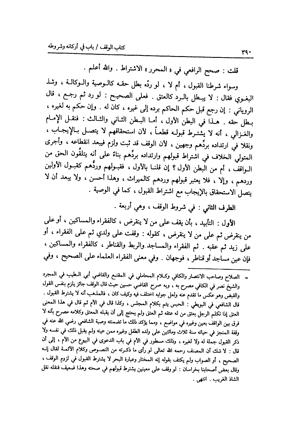 قلت: صحح الرافعي في المحرر الاشتراط. والله أعلم وسواء شرطنا القبول، أم لا، لو رده بطل حقه كالوصية والوكالة، وشذ البغوي فقال: لا يبطل بالرد كالعتق. فعلى الصحيح: لو رد ثم رجع، قال الروياني: إن رجع قبل حكم الحاكم برده إلى غيره، كان له. وإن حكم به لغيره، بطل حقه. هذا في البطن الاول، أما البطن الثاني والثالث: فنقل الامام والغزالي، أنه لا يشترط قبوله قطعا، لان استحقاقهم لا يتصل بالايجاب، ونقلا في ارتداده بردهم وجهين، لان الوقف قد ثبت ولزم فيبعد انقطاعه، وأجرى المتولي الخلاف في اشتراط قبولهم وارتداده بردهم بناء على أنهم يتلقون الحق من الواقف، أم من البطن الاول ؟ إن قلنا بالاول، فقبولهم وردهم كقبول الاولين وردهم، وإلا، فلا يعتبر قبولهم وردهم كالميراث، حسن، ولا يبعد أن لا يتصل الاستحقاق بالايجاب مع اشتراط القبول، كما في الوصية.