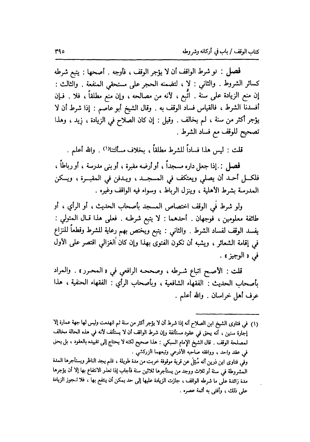 فصل لو شرط الواقف أن لا يؤجر الوقف، فأوجه. أصحها: يتبع شرطه كسائر الشروط. والثاني: لا، لتضمنه الحجر على مستحقي المنفعة. والثالث: إن منع الزيادة على سنة، اتبع، لانه من مصالحه، وإن منع مطلقا، فلا. فان أفسدنا الشرط، فالقياس فساد الوقف به. وقال الشيخ أبو عاصم: إذا شرط أن لا يؤجر أكثر من سنة، لم يخالف. وقيل: إن كان الصلاح في الزيادة، زيد، وهذا تصحيح للوقف مع فساد الشرط. قلت: ليس هذا فسادا للشرط مطلقا، بخلاف مسألتنا. والله أعلم فصل إذا جعل داره مسجدا، أو أرضه مقبرة، أو بنى مدرسة، أو رباطا، فلكل أحد أن يصلي ويعتكف في المسجد، ويدفن في المقبرة، ويسكن المدرسة بشرط الاهلية، وينزل الرباط، وسواء فيه الواقف وغيره. ولو شرط في الوقف اختصاص المسجد بأصحاب الحديث، أو الرأي، أو طائفة معلومين، فوجهان. أحدهما: لا يتبع شرطه. فعلى هذا قال المتولي: يفسد الوقف لفساد الشرط. والثاني: يتبع ويختص بهم رعاية للشرط وقطعا للنزاع في إقامة الشعائر، ويشبه أن تكون الفتوى بهذا وإن كان الغزالي اقتصر على الاول في الوجيز. قلت: الاصح اتباع شرطه، وصححه الرافعي في المحرر. والمراد بأصحاب الحديث: الفقهاء الشافعية، وبأصحاب الرأي: الفقهاء الحنفية، هذا عرف أهل خراسان. والله أعلم