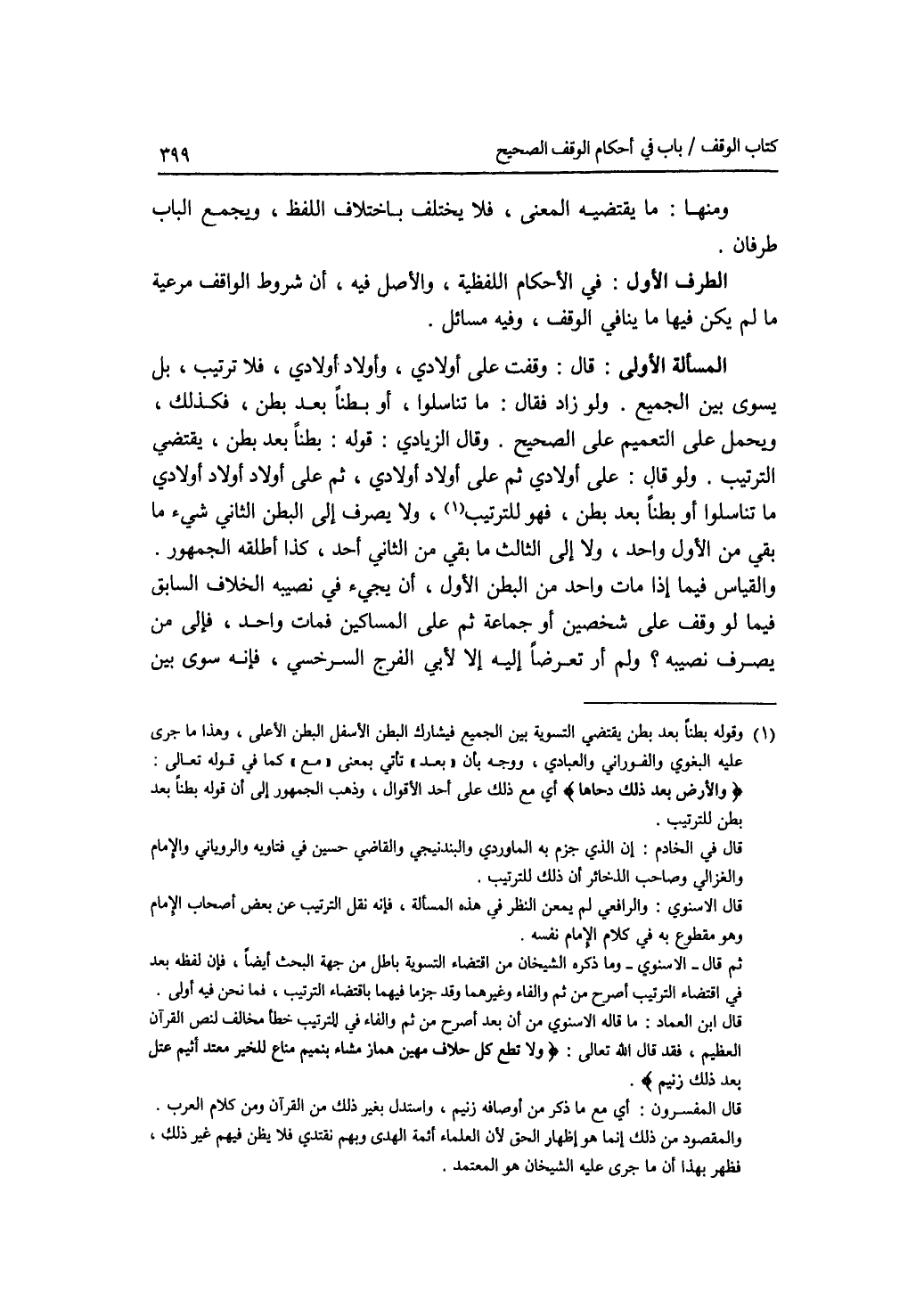 الطرف الأول : في الاحكام اللفظية، والاصل فيه، أن شروط الواقف مرعية ما لم يكن فيها ما ينافي الوقف، وفيه مسائل. المسألة الاولى: قال: وقفت على أولادي، وأولاد أولادي، فلا ترتيب، بل يسوى بين الجميع. ولو زاد فقال: ما تناسلوا، أو بطنا بعد بطن، فكذلك، ويحمل على التعميم على الصحيح. وقال الزيادي: قوله: بطنا بعد بطن، يقتضي الترتيب. ولو قال: على أولادي ثم على أولاد أولادي، ثم على أولاد أولاد أولادي ما تناسلوا أو بطنا بعد بطن، فهو للترتيب، ولا يصرف إلى البطن الثاني شئ ما بقي من الاول واحد، ولا إلى الثالث ما بقي من الثاني أحد، كذا أطلقه الجمهور. والقياس فيما إذا مات واحد من البطن الاول، أن يجئ في نصيبه الخلاف السابق فيما لو وقف على شخصين أو جماعة ثم على المساكين فمات واحد، فالى من يصرف نصيبه ؟ ولم أر تعرضا إليه إلا لابي الفرج السرخسي، فانه سوى بين