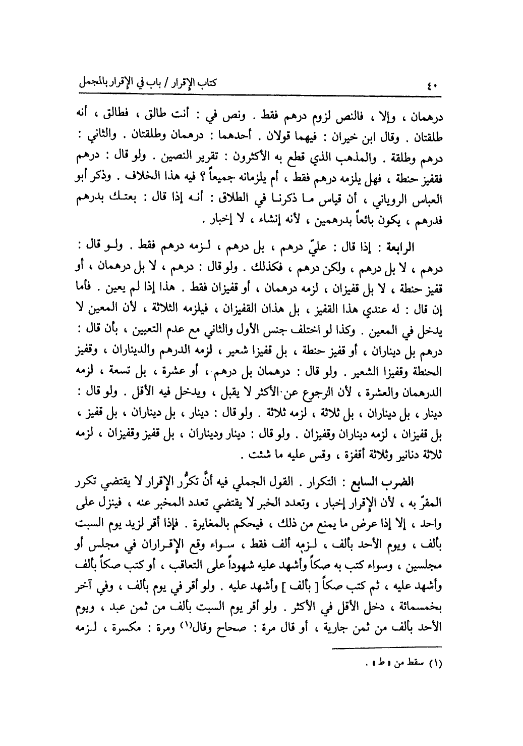 درهمان، وإلا، فالنص لزوم درهم (فقط). ونص في: أنت طالق، فطالق، أنه طلقتان. وقال ابن خيران: فيهما قولان. أحدهما: درهمان وطلقتان. والثاني: درهم وطلقة. والمذهب الذي قطع به الاكثرون: تقرير النصين. ولو قال: درهم فقفيز حنطة، فهل يلزمه درهم فقط، أم يلزمانه جميعا ؟ فيه هذا الخلاف. وذكر أبو العباس الروياني، أن قياس ما ذكرنا في الطلاق: أنه إذا قال: بعتك بدرهم فدرهم، يكون بائعا بدرهمين، لانه إنشاء، لا إخبار. الرابعة: إذا قال: علي درهم، بل درهم، لزمه درهم فقط. ولو قال: درهم، لا بل درهم، ولكن درهم، فكذلك. ولو قال: درهم، لا بل درهمان، أو قفيز حنطة، لا بل قفيزان، لزمه درهمان، أو قفيزان فقط. هذا إذا لم يعين. فأما إن قال: له عندي هذا القفيز، بل هذان القفيزان، فيلزمه الثلاثة، لان المعين لا يدخل في المعين. وكذا لو اختلف جنس الاول والثاني مع عدم التعيين، بأن قال: درهم بل ديناران، أو قفيز حنطة، بل قفيزا شعير، لزمه الدرهم والديناران، وقفيز الحنطة وقفيزا الشعير. ولو قال: درهمان بل درهم، أو عشرة، بل تسعة، لزمه الدرهمان والعشرة، لان الرجوع عن الاكثر لا يقبل، ويدخل فيه الاقل. ولو قال: دينار، بل ديناران، بل ثلاثة، لزمه ثلاثة. ولو قال: دينار، بل ديناران، بل قفيز، بل قفيزان، لزمه ديناران وقفيزان. ولو قال: دينار وديناران، بل قفيز وقفيزان، لزمه ثلاثة دنانير وثلاثة أقفزة، وقس عليه ما شئت. الضرب السابع: التكرار. القول الجملي فيه أن تكرر الاقرار لا يقتضي تكرر المقر به، لان الاقرار إخبار، وتعدد الخبر لا يقتضي تعدد المخبر عنه، فينزل على واحد، إلا إذا عرض ما يمنع من ذلك، فيحكم بالمغايرة. فإذا أقر لزيد يوم السبت بألف، ويوم الاحد بألف، لزمه ألف فقط، سواء وقع الاقراران في مجلس أو مجلسين، وسواء كتب به صحا وأشهد عليه شهودا على التعاقب، أو كتب صحا بألف وأشهد عليه، ثم كتب صكا (بألف) وأشهد عليه. ولو أقر في يوم بألف، وفي آخر بخمسمائة، دخل الاقل في الاكثر. ولو أقر يوم السبت بألف من ثمن عبد، ويوم الاحد بألف من ثمن جارية، أو قال مرة: صحاح، ومرة: مكسرة، لزمه