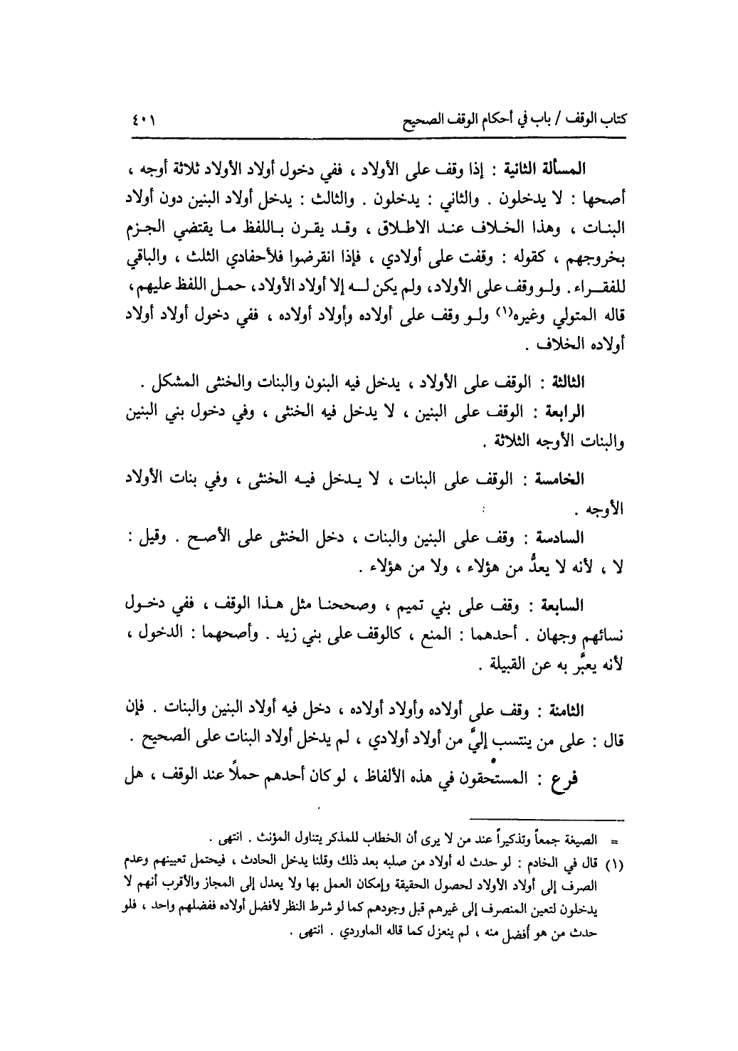 المسألة الثانية: إذا وقف على الاولاد، ففي دخول أولاد الاولاد ثلاثة أوجه، أصحها: لا يدخلون. والثاني: يدخلون. والثالث: يدخل أولاد البنين دون أولاد البنات، وهذا الخلاف عند الاطلاق، وقد يقرن باللفظ ما يقتضي الجزم بخروجهم، كقوله: وقفت على أولادي، فإذا انقرضوا فلاحفادي الثلث، والباقي للفقراء. ولو وقف على الاولاد، ولم يكن له إلا أولاد الاولاد، حمل اللفظ عليهم، قاله المتولي وغيره. ولو وقف على أولاده وأولاد أولاده، ففي دخول أولاد أولاد أولاده الخلاف. الثالثة: الوقف على الاولاد، يدخل فيه البنون والبنات والخنثى المشكل. الرابعة: الوقف على البنين، لا يدخل فيه الخنثى، وفي دخول بني البنين والبنات الاوجه الثلاثة. الخامسة: الوقف على البنات، لا يدخل فيه الخنثى، وفي بنات الاولاد الاوجه. السادسة: وقف على البنين والبنات، دخل الخنثى على الاصح. وقيل: لا، لانه لا يعد من هؤلاء، ولا من هؤلاء. السابعة: وقف على بني تميم، وصححنا مثل هذا الوقف، ففي دخول نسائهم وجهان. أحدهما: المنع، كالوقف على بني زيد. وأصحهما: الدخول، لانه يعبر به عن القبيلة. الثامنة: وقف على أولاده وأولاد أولاده، دخل فيه أولاد البنين والبنات. فان قال: على من ينتسب إلي من أولاد أولا دي، لم يدخل أولاد البنات على الصحيح. فرع المستحقون في هذه الالفاظ، لو كان أحدهم حملا عند الوقف، هل