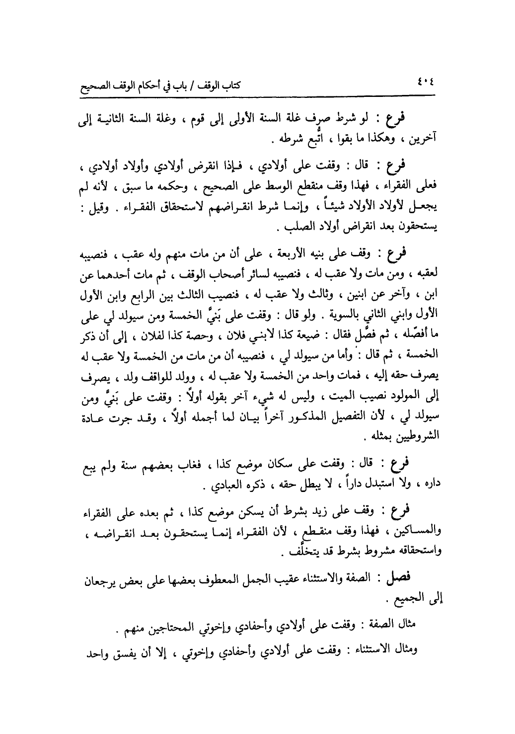 فرع لو شرط صرف غلة السنة الاولى إلى قوم، وغلة السنة الثانية إلى آخرين، وهكذا ما بقوا، اتبع شرطه. فرع قال: وقفت على أولادي، فإذا انقرض أولادي وأولاد أولادي، فعلى الفقراء، فهذا وقف منقطع على الوسط الصحيح، وحكمه ما سبق، لانه لم يجعل لاولاد الاولاد شيئا، وإنما شرط انقراضهم لاستحقاق الفقراء. وقيل يستحقون بعد انقراض أولاد الصلب. فرع وقف على بنيه الاربعة، على أن من مات منهم وله عقب، فنصيبه لعقبه، ومن مات ولا عقب له، فنصيبه لسائر أصحاب الوقف، ثم مات أحدهم عن ابن، وآخر عن ابنين، وثالث ولا عقب له، فنصيب الثالث بين الرابع وابن الاول الاول وابني الثاني بالسوية. ولو قال: وقفت على بني الخمسة ومن سيولد لي على ما افصله، ثم فصل فقال: ضيعة كذالابني فلان، وحصة كذا لفلان، إلى أن ذكر الخمسة، ثم قال: وأما من سيولد لي، فنصيبه أن من مات من الخمسة ولا عقب له يصرف حقه إليه، فمات واحد من الخمسة ولا عقب له، وولد للواقف ولد، يصرف إلى المولود نصيب الميت، وليس له شئ آخر بقوله أولا: وقفت على بني ومن سيولد لي، لان التفصيل المذكور آخرا بيان لما أجمله أولا، وقد جرت عادة الشروطيين بمثله. فرع قال: وقفت على سكان موضع كذا، فغاب بعضهم سنة ولم يبع داره، ولا استبدل دارا، لا يبطل حقه، ذكره العبادي. فرع وقف على زيد بشرط أن يسكن موضع كذا، ثم بعده على الفقراء والمساكين، فهذا (وقف) منقطع، لان الفقراء إنما يستحقون بعد انقراضه، واستحقاقه مشروط بشرط قد يتخلف.