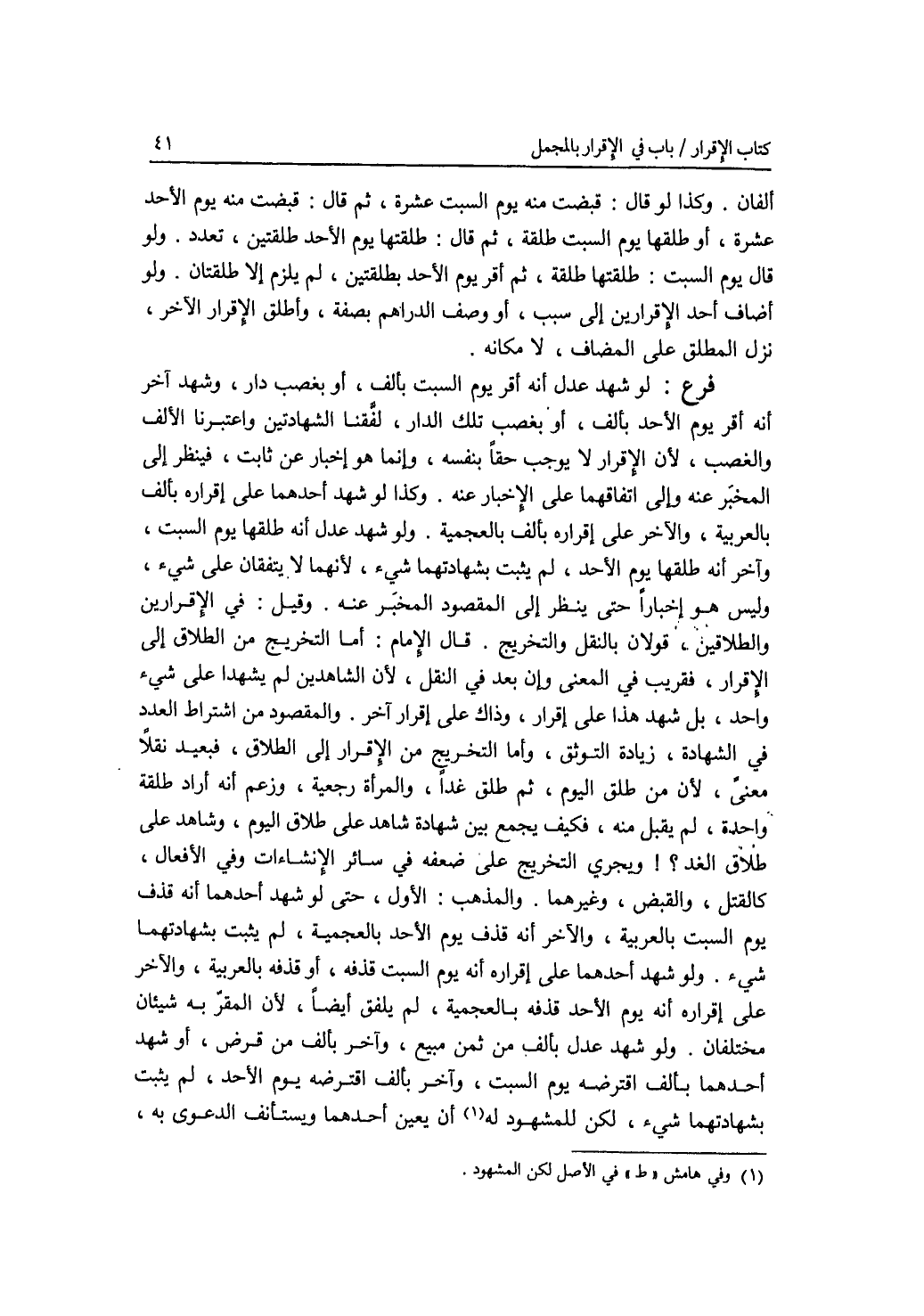 ألفان. وكذا لو قال: قبضت منه يوم السبت عشرة، ثم قال: قبضت منه يوم الاحد عشرة، أو طلقها يوم السبت طلقة، ثم قال: طلقتها يوم الاحد طلقتين، تعدد. ولو قال يوم السبت: طلقتها طلقة، ثم أقر يوم الاحد بطلقتين، لم يلزم إلا طلقتا ن. ولو أضاف أحد الاقرارين إلى سبب، أو وصف الدراهم بصفة، وأطلق الاقرار الآخر، نزل المطلق على المضاف، لامكانه. فرع لو شهد عدل أنه أقر يوم السبت بألف، أو بغصب دار، وشهد آخر أنه أقر يوم الاحد بألف، أو بغصب تلك الدار، لفقنا الشهادتين واعتبرنا الالف والغصب، لان الاقرار لا يوجب حقا بنفسه، وإنما هو إخبار عن ثابت، فينظر إلى المخبر عنه وإلى اتفاقهما على الاخبار عنه. وكذا لو شهد أحدهما على إقراره بألف بالعربية، والآخر على إقراره بألف بالعجمية. ولو شهد عدل أنه طلقها يوم السبت، وآخر أنه طلقها يوم الاحد، لم يثبت بشهادتهما شئ لانهما لا يتفقان على شئ، وليس هو إخبارا حتى ينظر إلى المقصود المخبر عنه. وقيل: في الاقرارين والطلاقين، قولان بالنقل والتخريج. قال الامام: أما التخريج من الطلاق إلى الاقرار، فقريب في المعنى وإن بعد في النقل، لان الشاهدين ليشهدا على شئ واحد، بل شهد هذا على إقرار، وذاك على إقرار آخر. والمقصود من اشتراط العدد في الشهادة، زيادة التوثق، وأما التخريج من الاقرار إلى الطلاق، فبعيد نقلا ومعنى، لان من طلق اليوم، ثم طلق غدا، والمرأة رجعية، وزعم أنه أراد طلقة واحدة، لم يقبل منه، فكيف يجمع بين شهادة شاهد على طلاق اليوم، وشاهد على طلاق الغد ؟ ! ويجري التخريج على ضعفه في سائر الانشاءات وفي الافعال، كالقتل، والقبض، وغيرهما. والمذهب: الاول، حتى لو شهد أحدهما أنه قذف يوم السبت بالعربية، والآخر أنه قذف يوم الاحد بالعجمية، لم يثبت بشهادتهما شئ. ولو شهد أحدهما على إقراره أنه يوم السبت قذفه، أو قذفه بالعربية، والآخر على إقراره أنه يوم الاحد قذفه بالعجمية، لم يلفق أيضا، لان المقر به شيئان مختلفان. ولو شهد عدل بألف من ثمن مبيع، وآخر بألف من قرض، أو شهد أحدهما بألف اقترضه يوم السبت، وآخر بألف اقترضه يوم الاحد، لم يثبت بشهادتهما شئ، لكن للمشهود له أن يعين أحدهما ويستأنف الدعوى به،