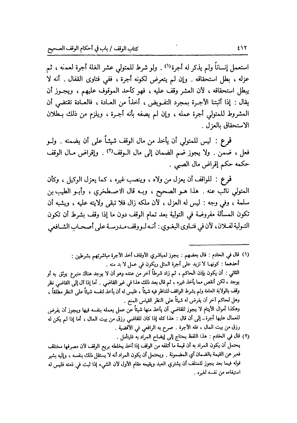 استعمل إنسانا ولم يذكر له أجرة. ولو شرط للمتولي عشر الغلة أجرة لعمله، ثم عزله، بطل استحقاقه. وإن لم يتعرض لكونه أجرة، ففي فتاوى القفال: أنه لا يبطل استحقاقه، لان العشر وقف عليه، فهو كأحد الموقوف عليهم، ويجوز أن يقال: إذا اثبتنا الاجرة بمجرد التفويض، أخذا من العادة، فالعادة تقتضي أن المشروط للمتولي أجرة عمله، وإن لم يصفه بأنه أجرة، ويلزم من ذلك بطلان الاستحقاق بالعزل. فرع ليس للمتولي أن يأخذ من مال الوقف شيئا على أن يضمنه. ولو فعل، ضمن. ولا يجوز ضم الضمان إلى مال الوقف. وإقراض مال الوقف حكمه حكم إقراض مال الصبي. فرع للواقف أن يعزل من ولاه، وينصب غيره، كما يعزل الوكيل، وكأن المتولي نائب عنه. هذا هو الصحيح، وبه قال الاصطخري، وأبو الطيب ابن سلمة. وفي وجه: ليس له العزل، لان ملكه زال فلا تبقى ولايته عليه، ويشبه أن تكون المسألة مفروضة في التولية بعد تمام الوقف دون ما إذا وقف بشرط أن تكون التولية لفلان، لان في فتاوى البغوي: أنه لو وقف مدرسة على أصحاب الشافعي