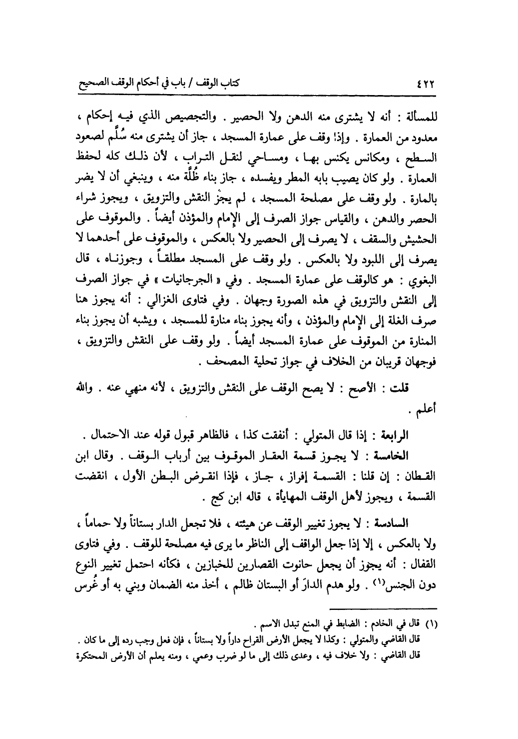 للمسألة: أنه لا يشترى منه الدهن ولا الحصير. والتجصيص الذي فيه إحكام، معدود من العمارة. وإذا وقف على عمارة المسجد، جاز أن يشترى منه سلم لصعود السطح، ومكانس يكنس بها، ومساحي لنقل التراب، لان ذلك كله لحفظ العمارة. ولو كان يصيب بابه المطر ويفسده، جاز بناء ظلة منه، وينبغي أن لا يضر بالمارة. ولو وقف على مصلحة المسجد، لم يجز النقش والتزويق، ويجوز شراء الحصر والدهن، والقياس جواز الصرف إلى الامام والمؤذن أيضا. والموقوف على الحشيش والسقف، لا يصرف إلى الحصير ولا بالعكس، والموقوف على أحدهما لا يصرف إلى اللبود ولا بالعكس. ولو وقف على المسجد مطلقا، وجوزناه، قال البغوي: هو كالوقف على عمارة المسجد. وفي الجرجانيات في جواز الصرف إلى النقش والتزويق في هذه الصورة وجهان. وفي فتاوى الغزالي: أنه يجوز هنا صرف الغلة إلى الامام والمؤذن، وأنه يجوز بناء منارة للمسجد، ويشبه أن يجوز بناء المنارة من الموقوف على عمارة المسجد أيضا. ولو وقف على النقش والتزويق، فوجهان قريبان من الخلاف في جواز تحلية المصحف. قلت: الاصح: لا يصح الوقف على النقش والتزويق، لانه منهي عنه. والله أعلم الرابعة: إذا قال المتولي: أنفقت كذا، فالظاهر قبول قوله عند الاحتمال. الخامسة: لا يجوز قسمة العقار الموقوف بين أرباب الوقف. وقال اب القطان: إن قلنا: القسمة إفراز، جاز، فإذا انقرض البطن الاول، انقضت القسمة، ويجوز لاهل الوقف المهايأة، قاله ابن كج. السادسة: لا يجوز تغيير الوقف عن هيئته، فلا تجعل الدار بستانا ولا حماما، ولا بالعكس، إلا إذا جعل الواقف إلى الناظر ما يرى فيه مصلحة للوقف. وفي فتاوى القفال: أنه يجوز أن يجعل حانوت القصارين للخبازين، فكأنه احتمل تغيير النوع دون الجنس. ولو هدم الدار أو البستان ظالم، أخذ منه الضمان وبني به أو غرس
