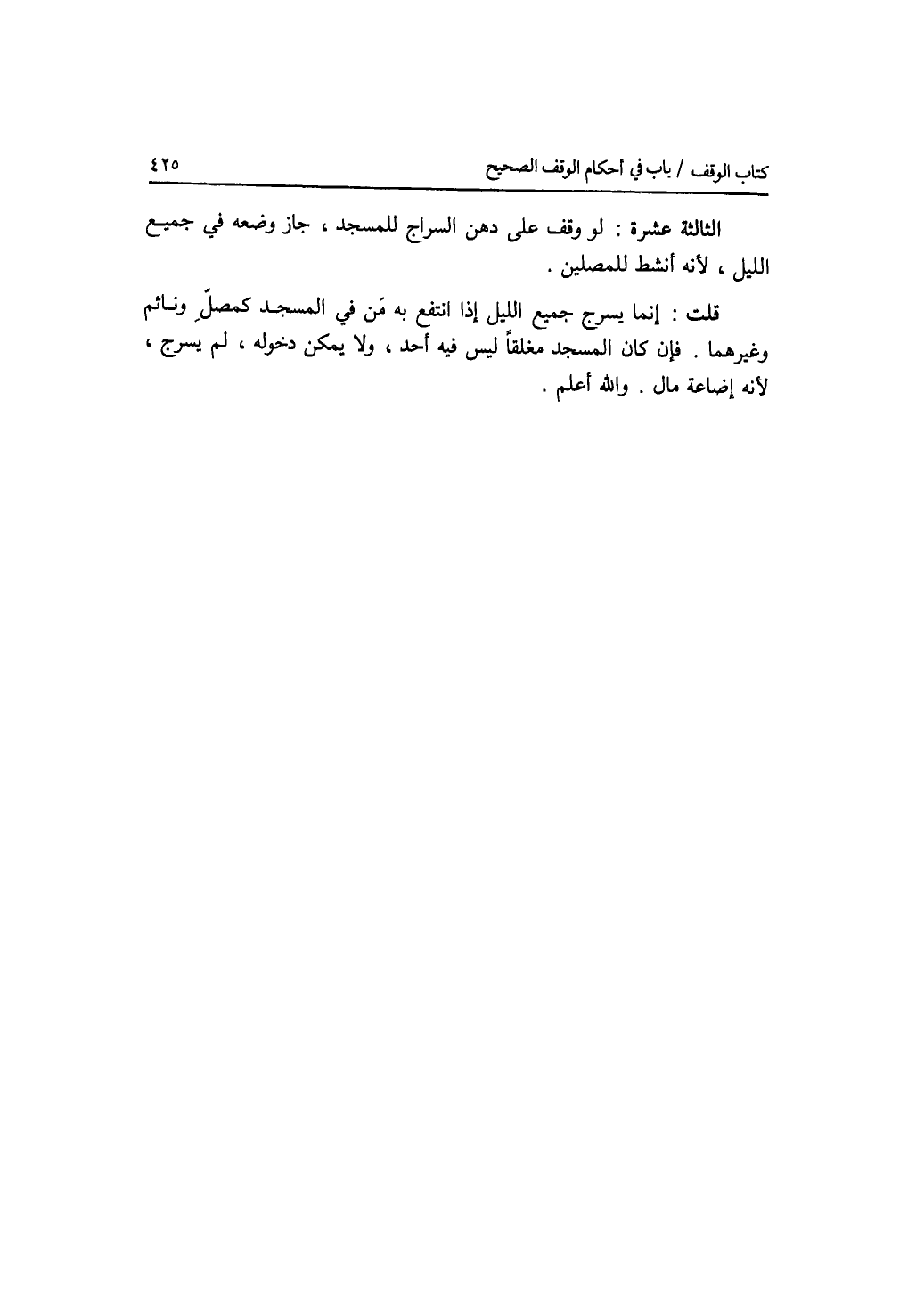 الثالثة عشرة: لو وقف على دهن السراج للمسجد، جاز وضعه في جميع الليل، لانه أنشط للمصلين. قلت: إنما يسرج جميع الليل إذا انتفع به من في المسجد كمصل ونائم وغيرهما. فإن كان المسجد مغلقا ليس فيه أحد، ولا يمكن دخوله، لم يسرج، لانه إضاعة مال. والله أعلم