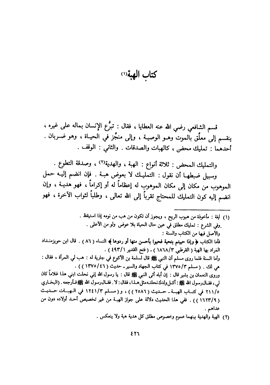 قسم الشافعي رضي الله عنه العطايا، فقال: تبرع الانسان بماله على غيره، ينقسم إلى معلق بالموت وهو الوصية، وإلى منجز في الحياة، وهو ضربان. أحدهما: تمليك محض، كالهبات والصدقات. والثاني: الوقف. والتمليك المحض: ثلاثة أنواع: الهبة، والهدية، وصدقة التطوع. وسبيل ضبطها أن نقول: التمليك لا بعوض هبة. فإن انضم إليه حمل الموهوب من مكان إلى مكان الموهوب له إعظاما له أو إكراما، فهو هدية، وإن انضم إليه كون التمليك للمحتاج تقربا إلى الله تعالى، وطلبا لثواب الآخرة، فهو