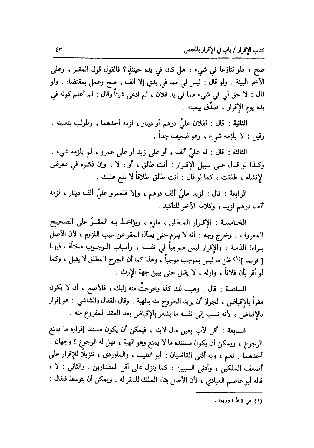 صح. فلو تنازعا في شئ، هل كان في يده حينئذ ؟ فالقول قول المقر، وعلى الآخر البينة. ولو قال: ليس لي مما في يدي إلا ألف، صح وعمل بمقتضاه. ولو قال: لا حق لي في شئ مما في يد فلان، ثم ادعى شيئا وقا: لم أعلم كونه في يده يوم الاقرار، صدق بيمينه. الثانية: قال: لفلان علي درهم أو دينار، لزمه أحدهما، وطولب بتعيينه. وقيل: لا يلزمه شئ، وهو ضعيف جدا. الثالثة: قال: له علي ألف، أو على زيد أو على عمرو، لم يلزمه شئ. وكذا لو قال على سبيل الاقرار: أنت طالق، أو، لا، وإن ذكره في معرض الانشاء، طلقت، كما لو قال: أنت طالق طلاقا لا يقع عليك. الرابعة: قال: لزيد علي ألف درهم، وإلا فلعمرو علي ألف دينار، لزمه ألف درهم لزيد، وكلامه الآخر للتأكيد. الخامسة: الاقرار المطلق، ملزم، ويؤاخذ به المقر على الصحيح المعروف. وخرج وجه: أنه لا يلزم حتى يسأل المقر عن سبب اللزوم، لان الاصل براءة الذمة، والاقرار ليس موجبا في نفسه، وأسباب الوجوب مختلف فيها. وربما ظن ما ليس بموجب موجبا، وهذا كما أن الجرح المطلق لا يقبل، وكما لو أقر بأن فلانا، وارثه، لا يقبل حتى يبين جهة الارث. السادسة: قال: وهبت لك كذا وخرجت منه إليك، فالاصح، أن لا يكون مقرا بالاقباض، لجواز أن يريد الخروج منه بالهبة. وقال القفال والشاش: هو إقرار بالاقباض، لانه نسب إلى نفسه ما يشعر بالاقباض بعد العقد المفروغ منه. السابعة: أقر الاب بعين مال لابنه، فيمكن أن يكون مستند إقراره ما يمنع الرجوع، ويمكن أن يكون مستنده ما لا يمنع وهو الهبة، فهل له الرجوع ؟ وجهان. أحدهما: نعم، وبه أفتى القاضيان: أبو الطيب، والماوردي، تنزيلا (للاقرار) على أضعف الملكين، وأدنى السببين، كما ينزل على أقل المقدارين. والثاني: لا، قاله أبو عاصم العبادي، لان الاصل بقاء الملك للمقر له. ويمكن أن يتوسط فيقال: