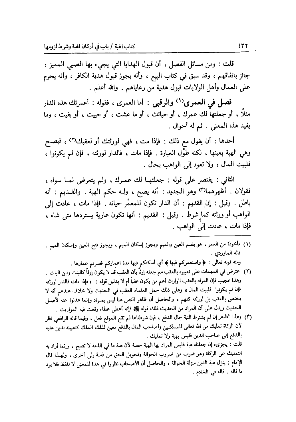 فصل في العمرى والرقبى أما العمرى، فقوله: أعمرتك هذه الدار مثلا، أو جعلتها لك عمرك، أو حياتك، أو ما عشت، أو حييت، أو بقيت، وما يفيد هذا المعنى. ثم له أحوال. أحدها: أن يقول مع ذلك: فإذا مت، فهي لورثتك أو لعقبك وهي الهبة بعينها، لكنه طول العبارة فإذا مات. فالدار لورثته، فان لم يكونوا، فلبيت المال، ولا يعود إلى الواهب بحال. الثاني: يقتصر على قوله: جعلتها لك عمرك، ولم يتعرض لما سواه، فقولان. أظهرهما وهو الجديد: أنه يصح، وله حكم الهبة. والقديم: أنه باطل. وقيل: إن القديم: أن الدار تكون للمعمر حياته. فإذا مات، عادت إلى الواهب أو ورثته كما شرط. وقيل: القديم: أنها تكون عارية يستردها متى شاء، فإذا مات، عادت إلى الواهب.