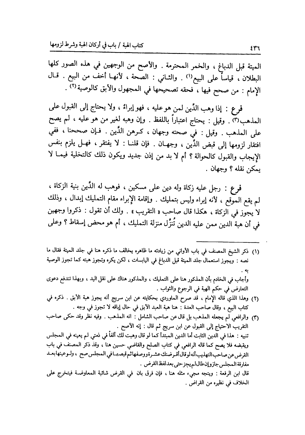 الميتة قبل الدباغ، والخمر المحترمة. والاصح من الوجهين في هذه الصور كلها البطلان، قياسا على البيع. والثاني: الصحة، لانها أخف من البيع. قال الامام: من صحح فيها، فحقه تصحيحها في المجهول والآبق كالوصية. فرع إذا وهب الدين لمن هو عليه، فهو إبراء، ولا يحتاج إلى القبول على المذهب. وقيل: يحتاج اعتبارا باللفظ. وإن وهبه لغير من هو عليه، لم يصح على المذهب. وقيل: في صحته وجهان، كرهن الدين. فإن صححنا، ففي افتقار لزومها إلى قبض الدين، وجهان. فإن قلنا: لا يفتقر، فهل يلزم بنفس الايجاب والقبول كالحوالة ؟ أم لا بد من إذن جديد ويكون ذلك كالتخلية فيما لا يمكن نقله ؟ وجهان. فرع رجل عليه زكاة وله دين على مسكين، فوهب له الذين بنية الزكاة، لم يقع الموقع، لانه إبراء بتمليك وإقامة الابراء مقام التمليك إبدال، وذلك لا يجوز في الزكاة، هكذ قال صاحب التقريب. ولك أن تقول: ذكروا وجهين في أن هبة الدين ممن عليه (الدين) تنزل منزلة التمليك، أم هو محض إسقاط ؟ وعلى هذا خرج اعتبار
