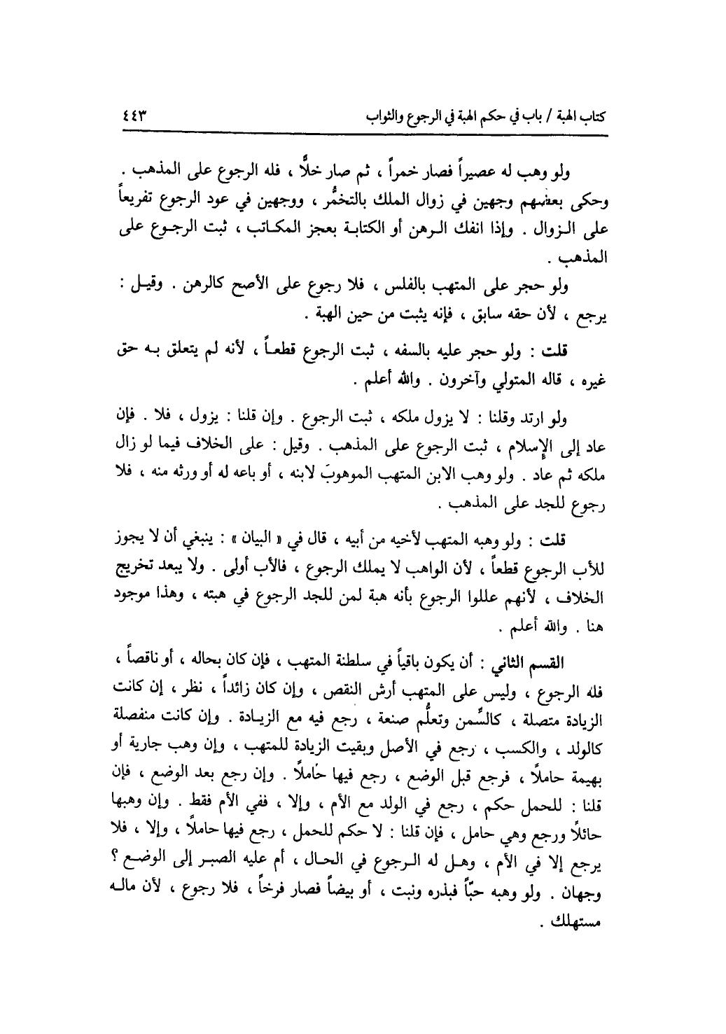 ولو وهب له عصيرا فصار خمرا، ثم صار خلا، فله الرجوع على المذهب. وحكى بعضهم وجهين في زوال الملك بالتخمر، ووجهين في عود الرجوع تفريعا على الزوال. وإذا انفك الرهن أو الكتابة بعجز المكاتب، ثبت الرجوع على المذهب. ولو حجر على المتهب بالفلس، فلا رجوع على الاصح كالرهن. وقيل: يرجع، لان حقه سابق، فانه يثبت من حين الهبة. قلت: ولو حجر عليه بالسفه، ثبت الرجوع قطعا، لانه لم يتعلق به حق غيره، قاله المتولي وآخرون. والله أعلم ولو ارتد وقلنا: لا يزول ملكه، ثبت الرجوع. وإن قلنا: يزول، فلا. فإن عاد إلى الاسلام، ثبت الرجوعلى المذهب. وقيل: على الخلاف فيما لو زال ملكه ثم عاد. ولو وهب الابن المتهب الموهوب لابنه، أو باعه له أو ورثه منه، فلا رجوع للجد على المذهب. قلت: ولو وهبه المتهب لاخيه من أبيه، قال في البيان: ينبغي أن لا يجوز للاب الرجوع قطعا، لان الواهب لا يملك الرجوع، فالاب أولى. ولا يبعد تخريج الخلاف لانهم عللوا الرجوع بأنه هبة لمن للجد الرجوع في هبته، وهذا موجود هنا. والله أعلم القسم الثاني: أن يكون باقيا في سلطنة المتهب، فإن كان بحاله، أو ناقصا، فله الرجوع، وليس على المتهب أرش النقص، وإن كان زائدا، نظر، إن كانت الزيادة متصلة، كالسمن وتعلم صنعة، رجع فيه مع الزيادة. وإن كانت منفصلة كالولد، والكسب، رجع في الاصل وبقيت الزيادة للمتهب. وإن وهب جارية أو بهيمة حاملا، فرجع قبل الوضع، رجع فيها حاملا. وإن رجع بعد الوضع، فإن قلنا: للحمل حكم، رجع في الولد مع الام، وإلا، ففي الام فقط. وإن وهبها حائلا ورجع وهي حامل، فإن قلنا: لا حكم للحمل، رجع فيها حاملا، وإلا، فلا يرجع إلا في الام، وهل له الرجوع في الحال، أم عليه الصبر إلى الوضع ؟ وجهان. ولو وهبه حبا فبذره ونبت، أو بيضا فصار فرخا، فلا رجوع، لان ماله