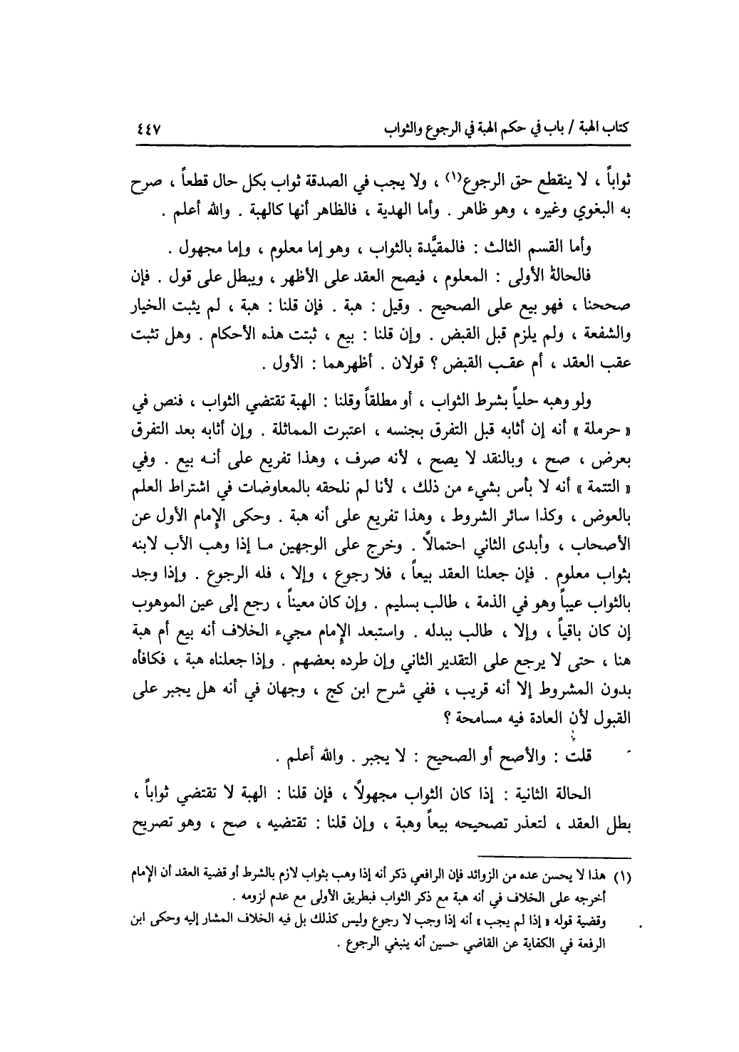 ثوابا، لا ينقطع حق الرجوع، ولا يجب في الصدقة ثواب بكل حال قطعا، صرح به البغوي وغيره، وهو ظاهر. وأما الهدية، فالظاهر أنها كالهبة. والله أعلم وأما القسم الثالث: فالمقيدة بالثواب، وهو إما معلوم، وإما مجهول. فالحالة الاولى: المعلوم، فيصح العقد على الاظهر، ويبطل على قول. فإن صححنا، فهو بيع على الصحيح. وقيل: هبة. فإن قلنا: هبة، لم يثبت الخيار والشفعة، ولم يلزم قبل القبض. وإن قلنا: بيع، ثبتت هذه الاحكام. وهل تثبت عقب العقد، أم عقب القبض ؟ قولان. أظهرهما: الاول. ولو وهبه حليا بشرط الثواب، أو مطلقا وقلنا: الهبة تقتضي الثواب، فنص في حرملة أنه إن أثابه قبل التفرق بجنسه، اعتبرت المماثلة. وإن أثابه بعد التفرق بعرض، صح، وبالنقد لا يصح، لانه صرف، وهذا تفريع ذلى أنه بيع. وفي التتمة أنه لا بأس بشئ من ذلك، لانا لم نلحقه بالمعاوضات في اشتراط العلم بالعوض، وكذا سائر الشروط، وهذا تفريع على أنه هبة. وحكى الامام الاول عن الاصحاب، وأبدى الثاني احتمالا. وخرج على الوجهين ما إذا وهب الاب لابنه بثواب معلوم. فإن جعلنا العقد بيعا، فلا رجوع، وإلا، فله الرجوع. وإذا وجد بالثواب عيبا وهو في الذمة، طالب بسليم. وإن كان معينا، رجع إلى عين الموهوب إن كان باقيا، وإلا، طالب ببدله. واستبعد الامام مجئ الخلاف أنه بيع أم هبة هنا، حتى لا يرجع على التقدير الثاني وإن طرده بعضهم. وإذا جعلناه هبة، فكافأه بدون المشروط إلا أنه قريب، ففي شرح ابن كج، وجهان في أنه هل يجبر على القبول لان العادة فيه مسامحة ؟ قلت: والاصح أو الصحيح: لا يجبر. والله أعلم الحالة الثانية: إذا كان الثواب مجهولا، فإن قلنا: الهبة لا تقتضي ثوابا، بطل العقد، لتعذر تصحيحه بيعا وهبة، وإن قلنا: تقتضيه، صح، وهو تصريح