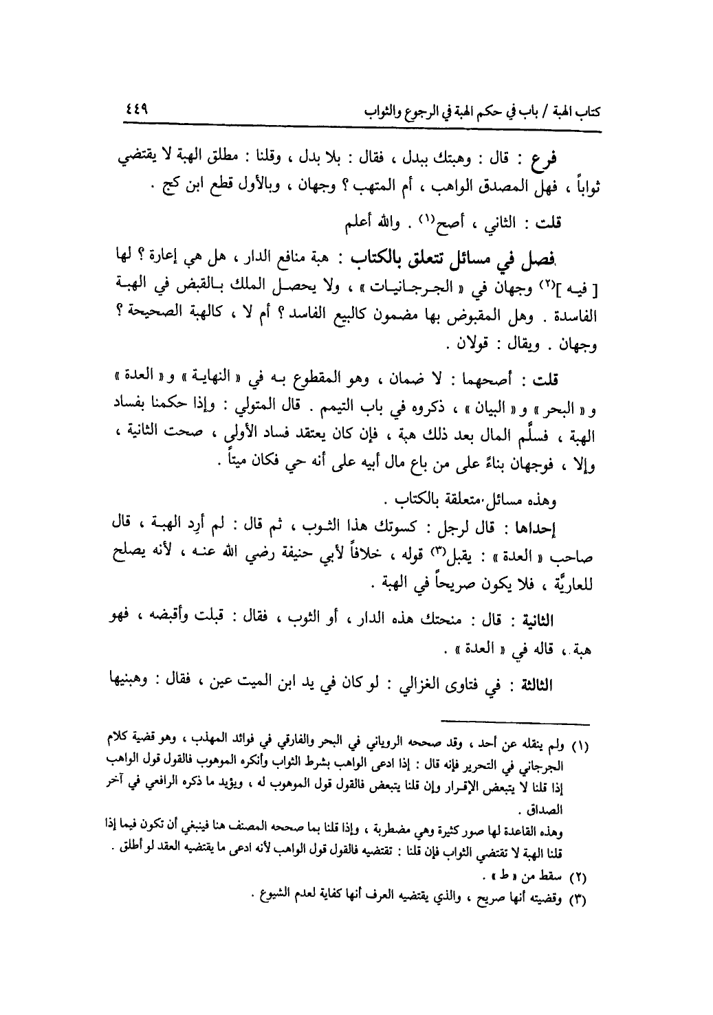 فصل في مسائل تتعلق بالكتاب هبة منافع الدار، هل هي إعارة ؟ لها وجهان في الجرجانيات، ولا يحصل الملك بالقبض في الهبة الفاسدة. وهل المقبوض بها مضمون كالبيع الفاسد ؟ أم لا، كالهبة الصحيحة ؟ وجهان. ويقال: قولان. قلت: أصحهما: لا ضمان، وهو المقطوع به في النهاية والعدة والبحر والبيان، ذكروه في باب التيمم. قال المتولي: وإذا حكمنا بفساد الهبة، فسلم المال بعد ذلك هبة، فإن كان يعتقد فساد الاولى، صحت الثانية، وإلا، فوجهان بناء على من باع مال أبيه على أنه حي فكان ميتا. وهذه مسائل متعلقة بالكتاب. إحداها: قال لرجل: كسوتك هذا الثوب، ثم قال: لم أرد الهبة، قال صاحب العدة: يقبل قوله، خلافا لابي حنيفة رضي الله عنه، لانه يصلح للعارية، فلا يكون صريحا في الهبة. الثانية: قال: منحتك هذه الدار، أو الثوب، فقال: قبلت وأقبضه، فهو هبة، قاله في العدة. الثالثة: في فتاوى الغزالي: لو كان في يد ابن الميت عين، فقال: وهبنيها