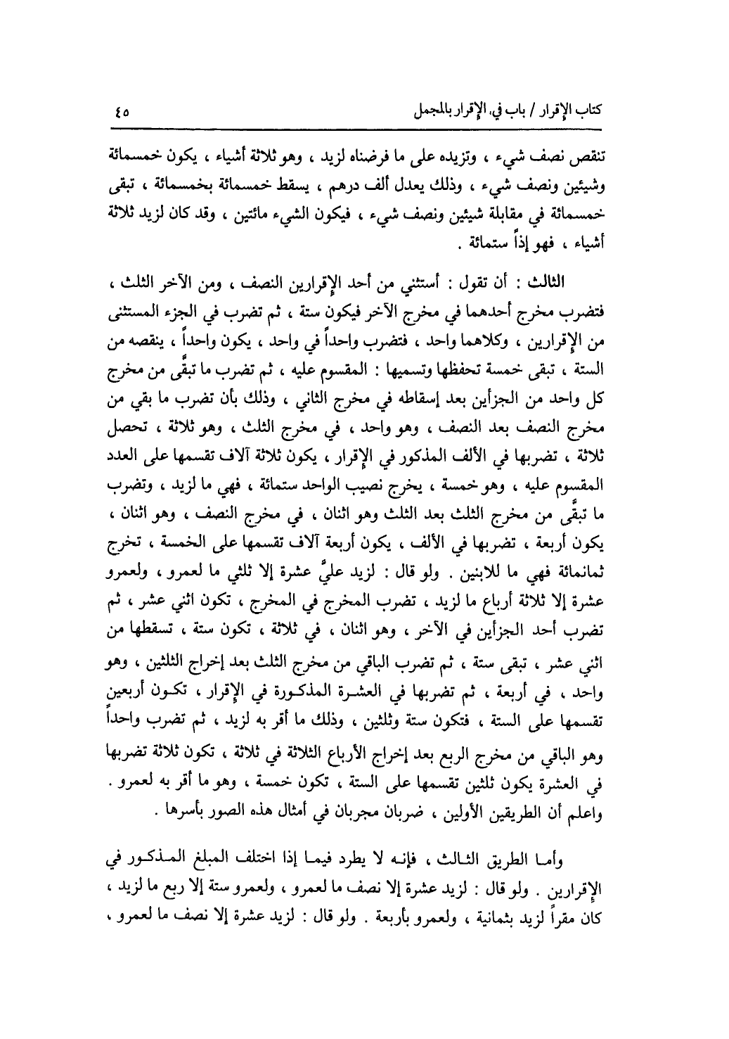 تنقص نصف شئ، وتزيده على ما فرضناه لزيد، وهو ثلاثة أشياء، يكون خمسمائة وشيئين ونصف شئ، وذلك يعدل ألف درهم، يسقط خمسمائة بخمسمائة، تبقى خمسمائة في مقابلة شيئين ونصف شئ، فيكون الشئ مائتين، وقد كان لزيد ثلاثة أشياء، فهو إذا ستمائة. الثالث: أن تقول: استثني من أحد الاقرارين النصف، ومن الآخر الثلث، فتضرب مخرج أحدهما في مخرج الآخر فيكون ستة، ثم تضرب في الجزء المستثنى من الاقرارين، وكلاهما واحد، فتضرب واحدا في واحد، يكون واحدا، ينقصه من الستة، تبقى خمسة تحفظها وتسميها: المقسوم عليه، ثم تضرب ما تبقى من مخرج كل واحد من الجزئين بعد إسقاطه في مخرج الثاني، وذلك بأن تضرب ما بقي من مخرج النصف بعد النصف، وهو واحد، في مخرج الثلث، وهو ثلاثة، تحصل ثلاثة، تضربها في الالف المذكور في الاقرار، يكون ثلاثة آلاف تقسمها على العدد المقسوم عليه، وهو خمسة يخرج نصيب الواحد ستمائة، فهي ما لزيد، وتضرب ما تبقى من مخرج الثلث بعد الثلث وهو اثنان، في مخرج النصف، وهو اثنان، يكون أربعة، تضربها في الالف، يكون أربعة آلاف تقسمها على الخمسة، تخرج ثمانمائة فهي ما للابنين. ولو قال لزيد علي عشرة إلا ثلثي ما لعمرو، ولعمرو عشرة إلا ثلاثة أرباع ما لزيد، تضر ب المخرج في المخرج، تكون اثني عشر، ثم تضرب أحد الجزئين في الآخر، وهو اثنان، في ثلاثة، تكون ستة، تسقطها من اثني عشر، تبقى ستة، ثم تضرب الباقي من مخرج الثلث بعد إخراج الثلثين، وهو واحد، في أربعة، ثم تضربها في العشرة المذكورة في الاقرار، تكون أربعين تقسمها على الستة، فتكون ستة وثلثين، وذلك ما أقر به لزيد، ثم تضرب واحدا وهو الباقي من مخرج الربع بعد إخراج الارباع الثلاثة في ثلاثة، تكون ثلاثة تضربها في العشرة يكون ثلثين تقسمها على الستة، تكون خمسة، وهو ما أقر به لعمرو. ولعلم أن الطريقين الاولين، ضربان مجربان في أمثال هذه الصور بأسرها. وأما الطريق الثالث، فإنه لا يطرد فيما إذا اختلف المبلغ المذكور في الاقرارين. ولو قال: لزيد عشرة إلا نصف ما لعمرو، ولعمرو ستة إلا ربع ما لزيد، كان مقرا لزيد بثمانية، ولعمرو بأربعة. ولو قال: لزيد عشرة إلا نصف ما لعمرو،